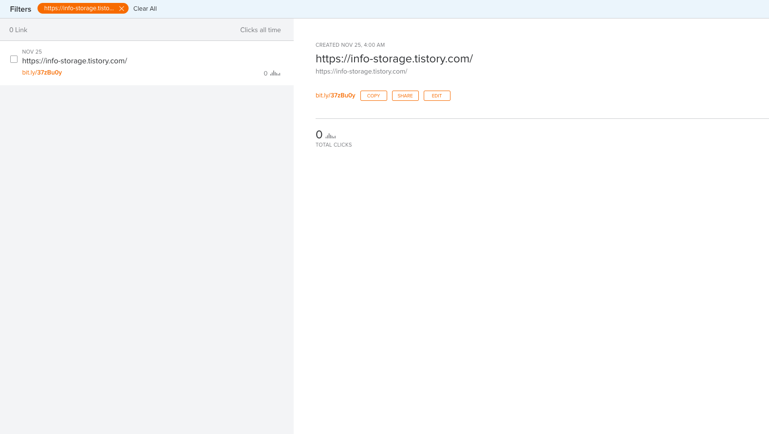 창을 나오게 되면 메인 상황판에 필자의 블로그 주소가 생겼으며 아래에는 단축된 비틀리 도메인이 생성되었다. 그 아래에는 총 몇 명이 클릭했는지에 대한 지표가 나온다. 이 지표를 활용하여 보통 마케팅 업계에서 'CPC(Cost Per Click)'을 매기게 된다. 참고로 'CPC'란 클릭당 단가로서 제휴 마케팅이나 어플 마케팅에 많이 사용하는 단어이다.