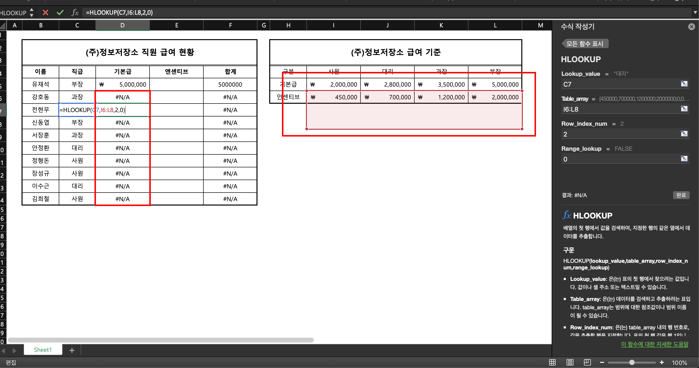 우리가 채워야 할 부분 중 유재석 부장의 기본급 칸을 먼저 채워보자. 급여 기준은 우측 표에 정리가 되어 있다. 부장 치고는 조금 작은 급여인 거 같다. 아무래도 스타트업이라 그런가. 어찌 됐건 여기에 hlookup 함수를 넣어주자. 아까 vlookup 함수를 보고 왔다면 너무나 스근하게 눈치를 챘을 것이다. 각 직급을 기준으로 급여가 다르기 때문에 기준값은 당연히 '직급'이 될 것이다. 따라서 기준값을 넣어야 할 lookup_value에는 C5열에 있는 '부장' 데이터를 기준으로 하자.