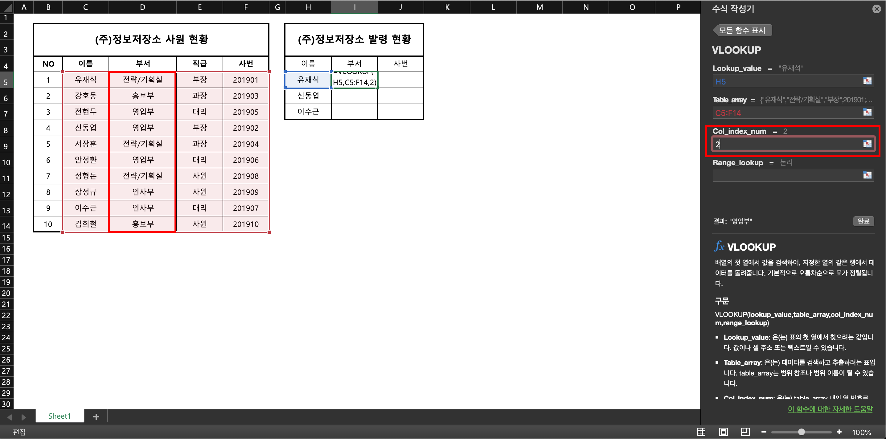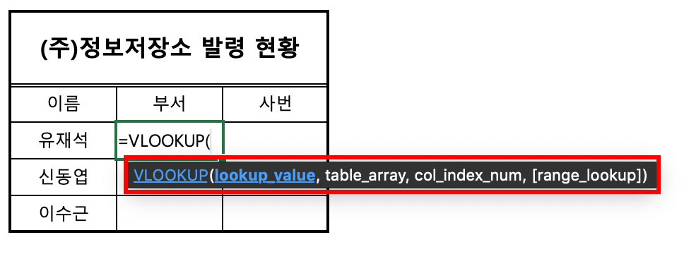 그 다음으로 'col_index_num' 함수를 설정해야 한다. 이 함수는 쉽게 말해 어떤 열에 있는 데이터 값을 가져오는 것인지를 묻는 것이다. 우리가 부서란을 채워야 하는 상황이기에 두 번째 단계(table_array)에서 선택한 범위 중 2번째 열에 해당하기 때문에 '2'를 기입한다.