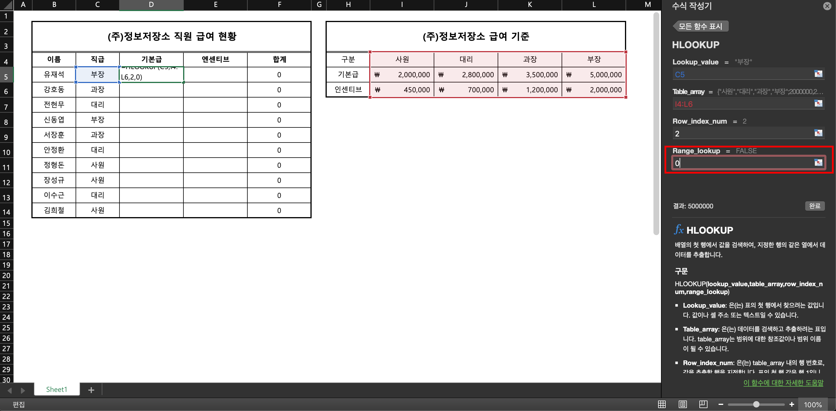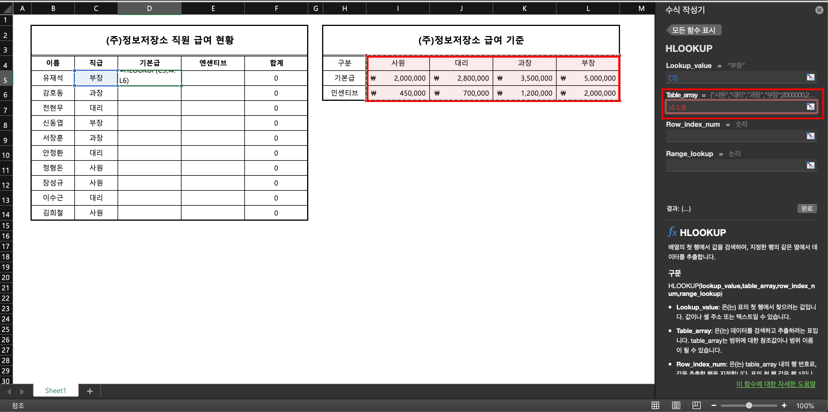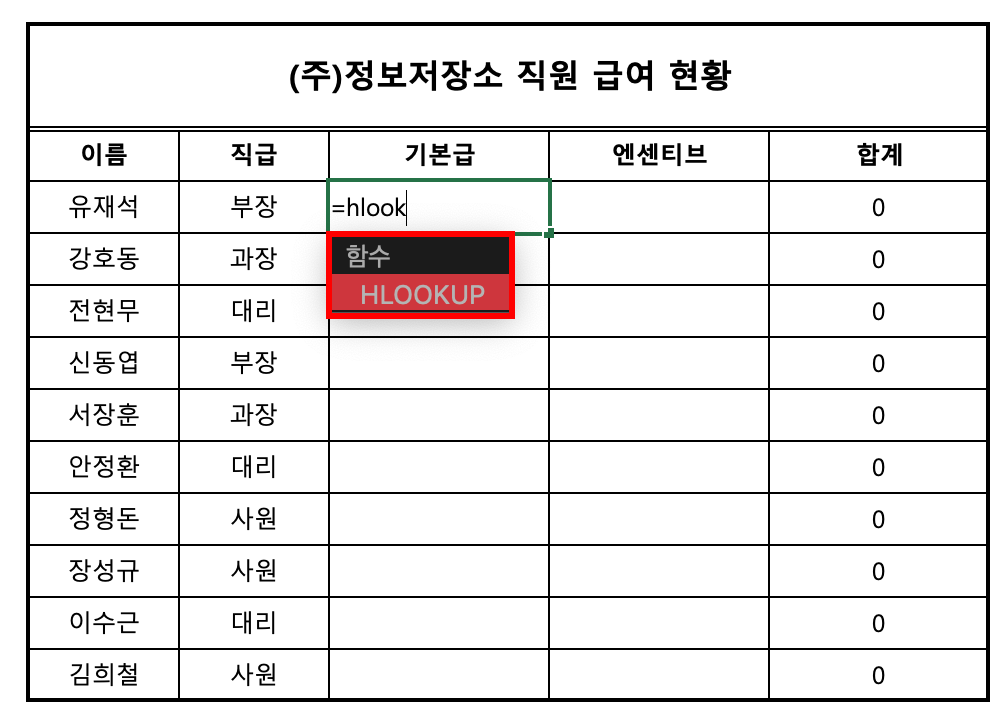 상황 예시] 필자는 (주)정보저장소 회사의 대표자로서 10명의 직원의 급여 현황을 체크하고자 한다. 각 직급별로 기본급과 인센티브를 설정을 했고, 직원 개개인의 기본급과 인센티브 합계를 계산하고자 하나 이것 역시 일일이 대조하며 기입하기 매우 귀찮은 상황이다. 이럴 때는 어떤 함수를 써야 하는가?