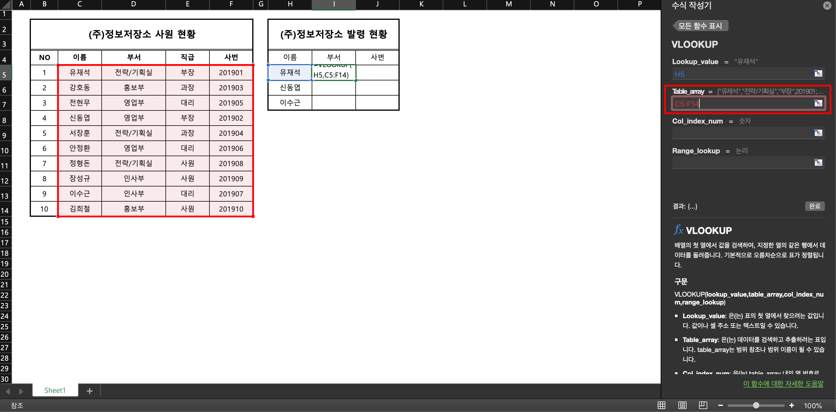 위의 상황에서 답이 될 수 있는 것은 당연히 'vlookup' 함수라고 할 수 있다. 먼저 사원 현황을 보면 우리들의 눈에 굉장히 익숙한 10명의 직원 이름이 보인다. 그리고 우측에 발령 현황 명단에는 유재석, 신동엽, 이수근 3명의 이름은 기입되어 있으나 각 개인의 정보인 부서, 사번 란은 비워져 있다. 물론 10명 정도의 소량이면 찾아서 입력하는 게 더 빠를 수 있으나 나중에 몇백 명 되는 단위를 일일이 찾아서 기입하기란 불가능한 수준 일터. 그렇기 때문에 저기 빈칸을 채울 수 있는 vlookup 함수를 사용해보자.