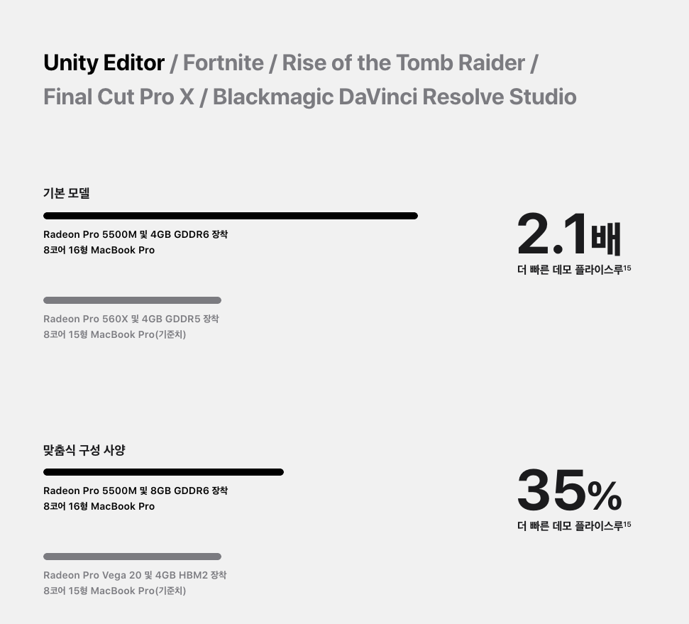 그래픽 카드 또한 업그레이드가 되었다. 앞서 말한 성능들 모두 영상, 이미지 등을 편집할 때 필요한 기능들이었다. 여기서 화룡점정을 찍는 게 바로 그래픽 카드인데, 맥북 프로 16인치의 경우 AMD Radeon Pro 5000M 시리즈를 탑재할 수 있으며, 이는 이전 모델에 탑재된 그래픽 카드와 비교했을 때 2배 이상 빠른 성능을 자랑한다고 한다. 따라서 평소 디자인 작업을 할 때 화면에서 보이는 디테일한 픽셀 값까지 확인하여 편집할 수 있으며, 보다 더 매끄럽게 재생하고 렌더링 또한 더 빨라지기 때문에 효율적인 작업이 가능해졌다고 볼 수 있다.