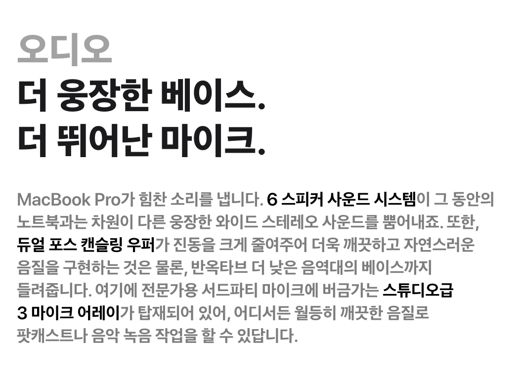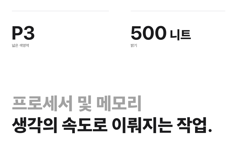 또한 500 니트 밝기의 극적인 하이라이트와 밝은 화이트를 보여주는 동시에 정교한 광배향 기술이 적용되어 작은 픽셀 크기도 디테일하게 보여줄 수 있는 레티나 디스플레이를 탑재하였다. 또한 P3 수준의 넓은 색 영역을 바탕으로 이미지 콘텐츠를 제작했을 때 훨씬 더 선명하고 생생한 작업물을 만들 수 있을 거 같다. 전반적으로 이번 모델은 원래도 그랬지만 영상, 사진 편집에 굉장히 초점을 맞춘 기능들이 탑재되어 이 쪽 관련된 종사자 분들이 사용하기 딱 좋을 거 같다. 실제로 필자 주변에 영상이나 사진을 다루는 분들이 계신다 다들 맥북을 '기본'으로 사용하고 계신다.