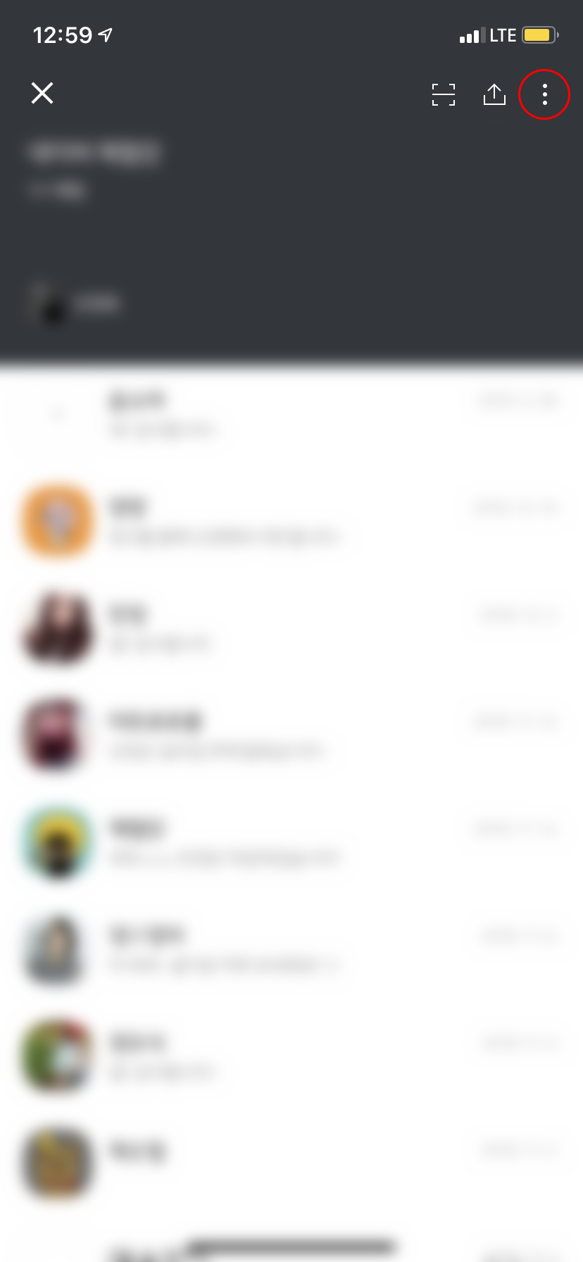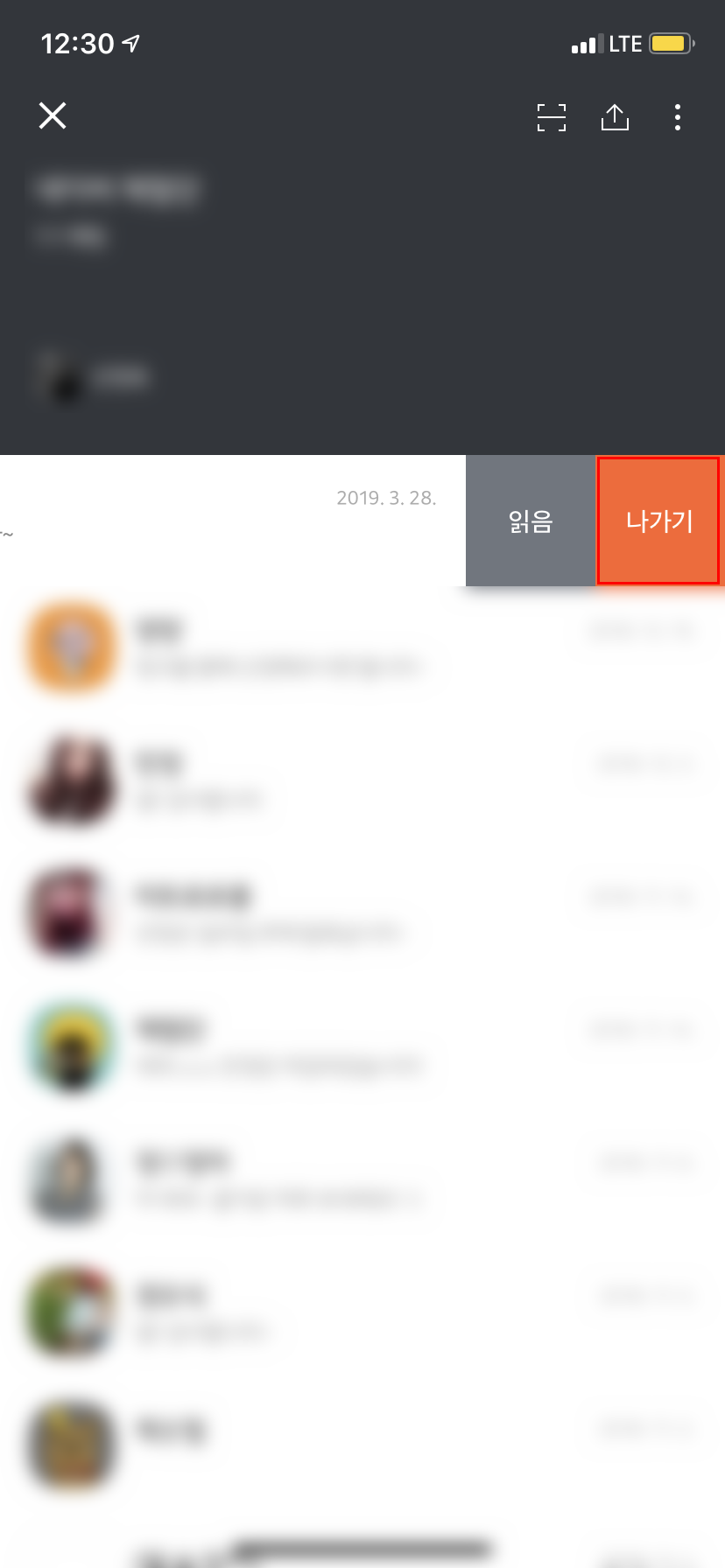 참고로 그룹 채팅방은 강퇴 기능만 있기 때문에(채팅방을 나가면 그 방은 폭파되기 때문에 없는 기능이라고 생각하면 된다.) 두번째 방법을 사용하여 프로필을 탭 하여 강퇴하기를 하면 된다.