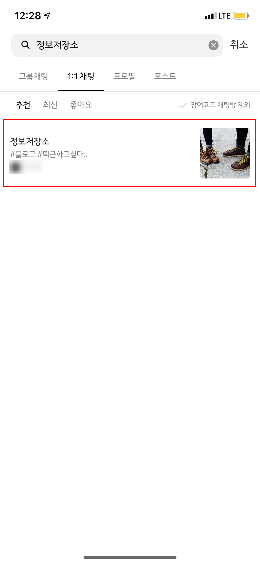 필자는 '정보저장소'라는 키워드를 검색하여 타고 들어갔더니 필자가 생성한 방이 나와있다. 이렇게 제목과 해시태그의 관련도를 참고하여 채팅방 목록이 등장하게 되니 이 점 참고하자.