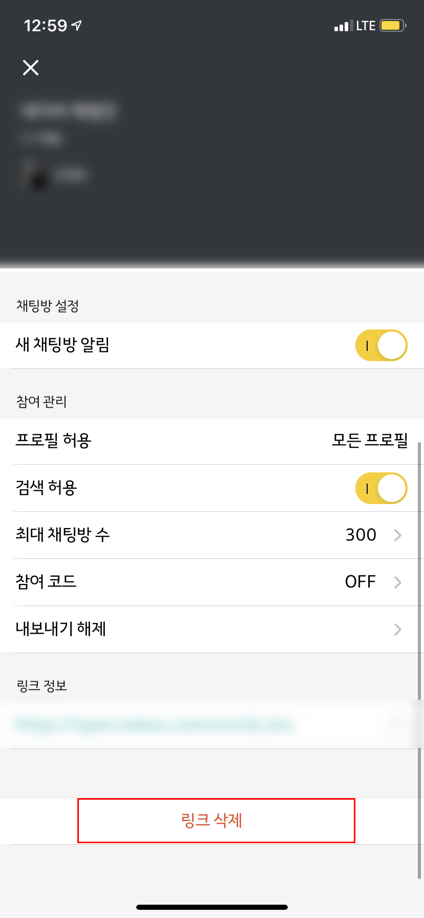 마지막으로 오픈채팅방 삭제하는 방법을 살펴보자. 여러 가지 상황에 의해 부득이하게 채팅방을 삭제해야 할 경우가 있을 것이다. 그럴 때는 이렇게 해서 삭제를 해보자. 내 채팅방의 우측 상단에 보면 '점 3개' 아이콘이 있다. 설정창인데 해당 아이콘을 클릭하고 아래로 스크롤을 내리면 '링크 삭제'라는 란이 나온다. 그것을 클릭하면 채팅방은 깔끔하게 없어진다.