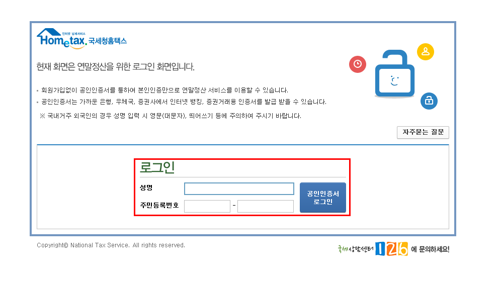 물론 클릭을 한다고 해서 바로 넘어가는 것은 아니다. 로그인을 필수적으로 거쳐야 국세청에서 내 정보를 바탕으로 세액 간소화 자료를 띄어주기 때문이다. 참고로 회원가입은 별도로 필요가 없으나 내 정보와 내 공인인증서가 등록이 되야 로그인이 가능하다. 만약 공인인증서 등록을 안 했다면 최초 메인화면에서 제일 오른쪽 메뉴인 '홈텍스'를 클릭하여 홈텍스에서 내 정보와 공인인증서를 먼저 등록을 해야 로그인을 할 수 있다. 이미 등록이 되어 있다면 자신의 이름, 주민등록번호를 기입하고 그 다음으로 공인인증서 로그인을 하면 된다.