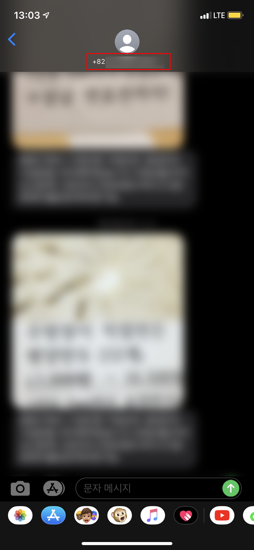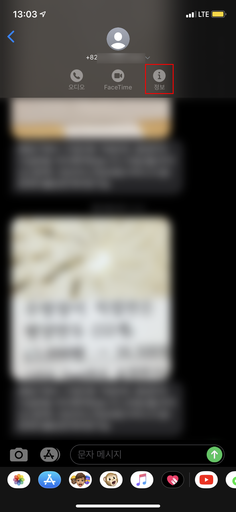 가장 먼저 아이폰을 실행해서 '메세지' 앱을 실행해보도록 하자. 앱을 실행하고 자신이 차단하고자 하는 스팸 혹은 광고 문자를 들어간다. 중간 사진과 마찬가지로 특정 업체에서 지속적으로 피싱 문제를 보내고 있다. (물론 해당 업체는 필자가 많이 이용하는 곳이라 차단은 안 했으나 예를 들기 위해 가져왔다.) 해당 업체의 문자 내용을 차단하고자 한다면 상단에 해당 업체의 번호를 탭 해보도록 하자. 그럼 우측 사진에 나오는 거처럼 아이콘 3개가 뜰 것이다. 이 3개 중 제일 오른쪽에 있는 아이콘 '정보'를 탭 해보도록 하자.