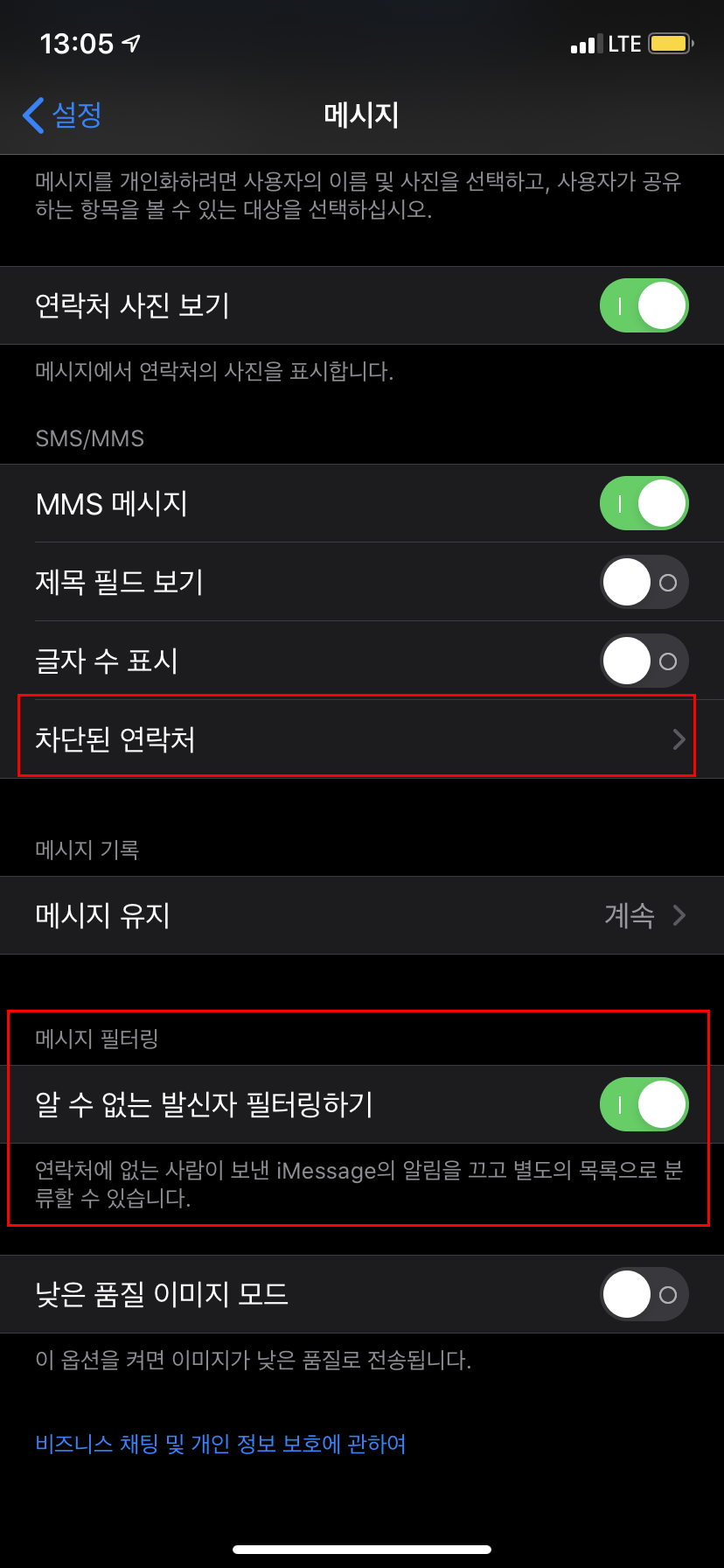 여기서 우리는 '차단된 연락처'를 통해 스팸문자 차단한 목록을 확인할 수 있다. 또한 아까 꿀팁과 마찬가지로 하단에 '알 수 없는 발신자 필터링'을 활성화하면 자신의 휴대폰에 저장되지 않은 알 수 없는 사람으로부터 온 메세지가 왔을 경우 알림을 끄고, 별도의 목록으로 구분할 수 있다. 차단을 하는 것도 좋지만 조기에 차단을 원한다면 이 기능을 활용해도 좋을 거 같다.