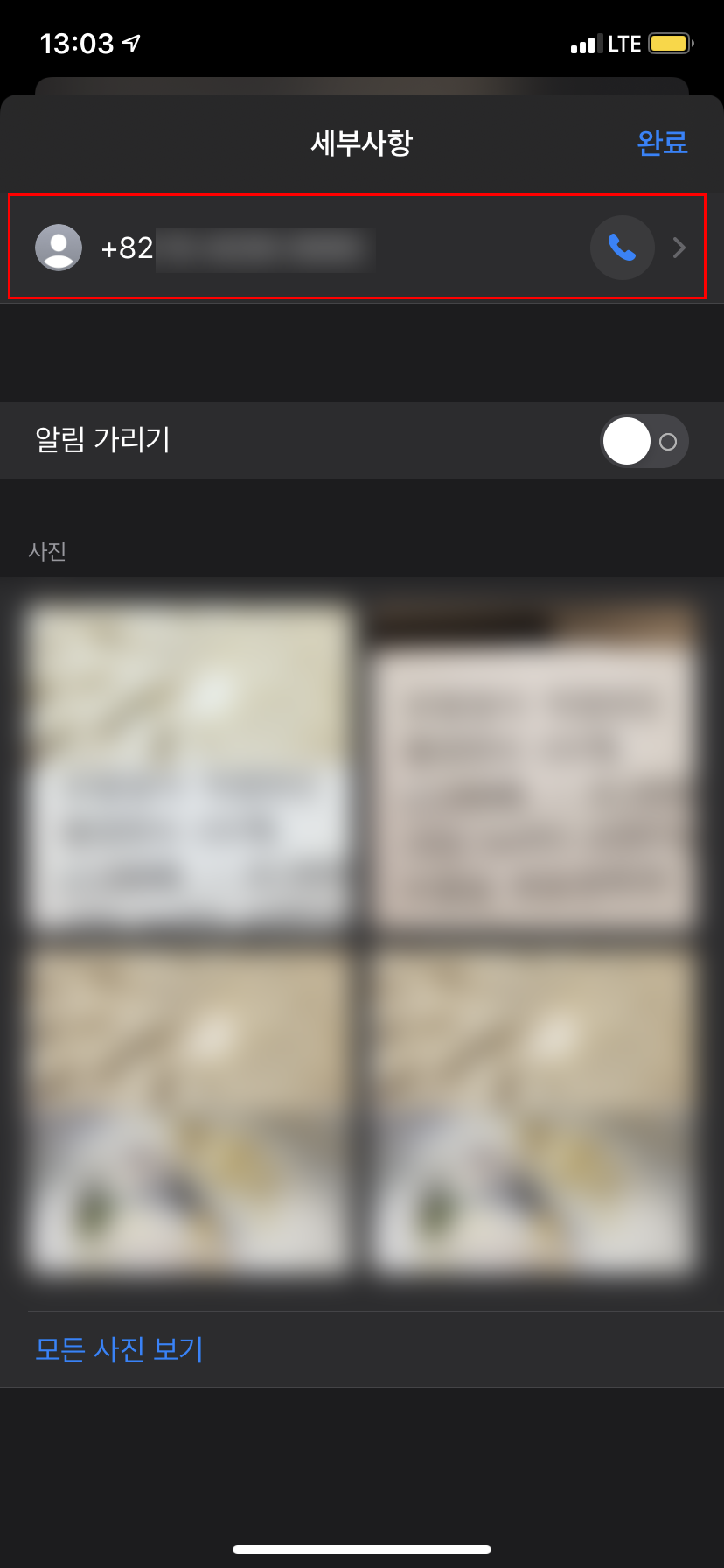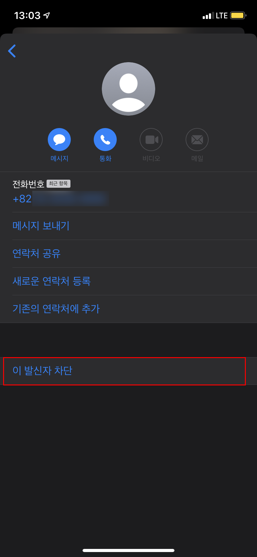 정보 메뉴를 탭 해서 들어가면 해당 번호와 문자 내용 중에 사진 파일이 오고 간 내역 등이 나오게 된다. 여기서 해당 업체의 번호를 탭 해주면 우측 화면으로 넘어간다. 우측 화면에서 바로 아래에 보면 우리에게 굉장히 익숙한 '이 발신자 차단'이라는 메뉴가 보일 것이다. 이 메뉴를 탭 해주면 스근하게 아이폰 스팸문자 차단이 완료된다.
