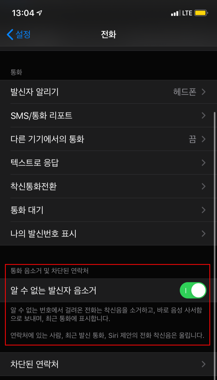 아이폰 전화 차단 관련해서 팁을 하나 주자면 간혹 알 수 없는 발신자에게 전화가 오는 경우가 있다. 물론 번호 저장이 안 된 지인이나 거래처에서 연락이 오는 경우도 있겠지만, 대부분 피싱과 관련된 전화이거나 광고와 관련된 스팸 전화들이 대부분일 것이다. 그런 경우 차라리 무시를 하고 싶다면 아까 전화 메뉴 항목에서 차단된 연락처 바로 위에 '알 수 없는 발신자 음소거'를 활성화해주면 된다. 그럼 알 수 없는 발신자가 연락이 올 경우 착신음이 자동으로 무음으로 처리되며, 최근 통화에 부재중으로 남게 된다.
