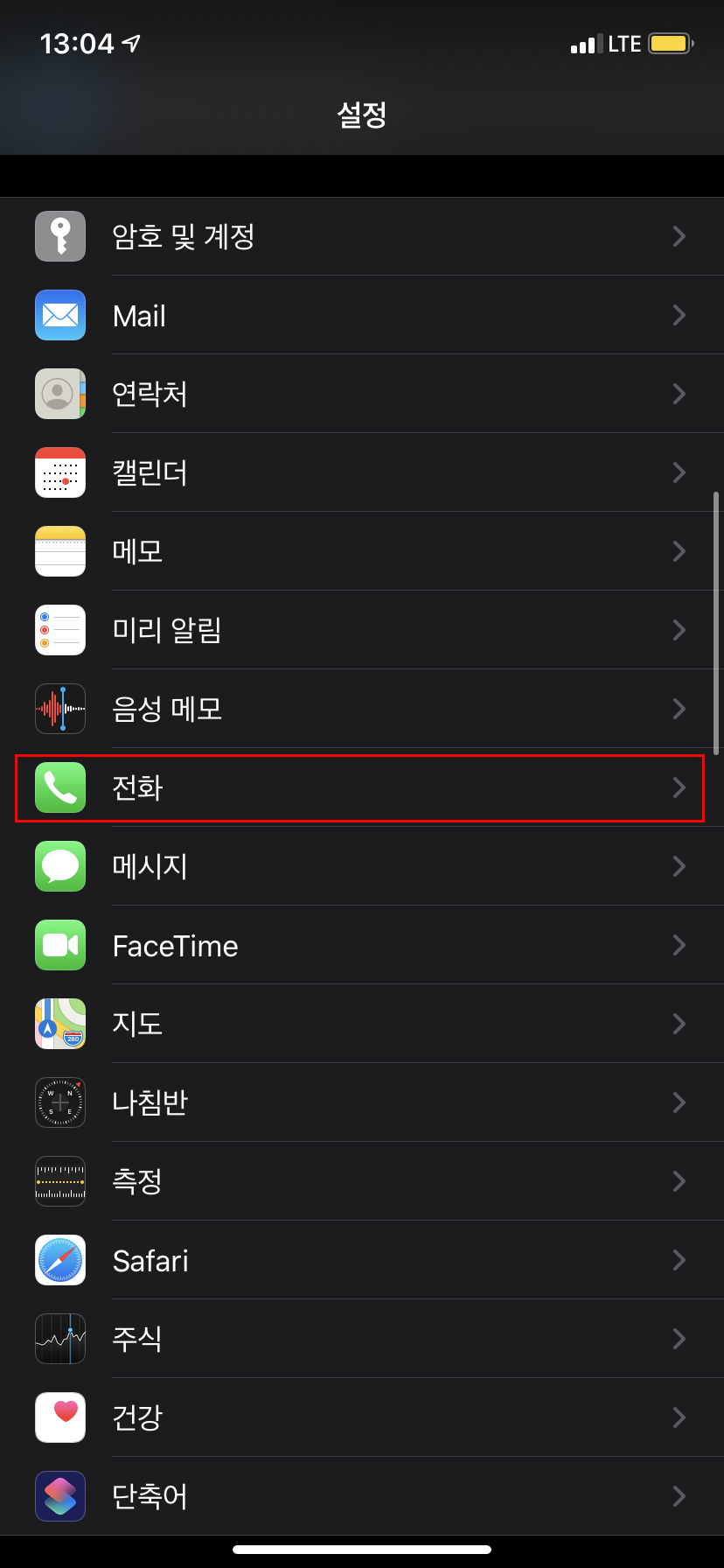 위에서 전화번호 차단을 하고 난 후 다시 알아보니 내가 만약 잘못 착각하고 차단했다면 서둘러 그 차단을 풀어주는 게 나을 것이다. 하지만 어디서 내가 차단한 목록을 알 수 있는지 알 길이 없을 것이다. 그럼 그 목록은 어떻게 확인하느냐? 가장 먼저 '설정'앱을 실행하도록 하자. 그럼 제일 좌측 화면에 나오는 바와 같이 스크롤을 조금 내리다 보면 '전화'라는 메뉴가 나올 것이다. 이 메뉴를 탭해주자.