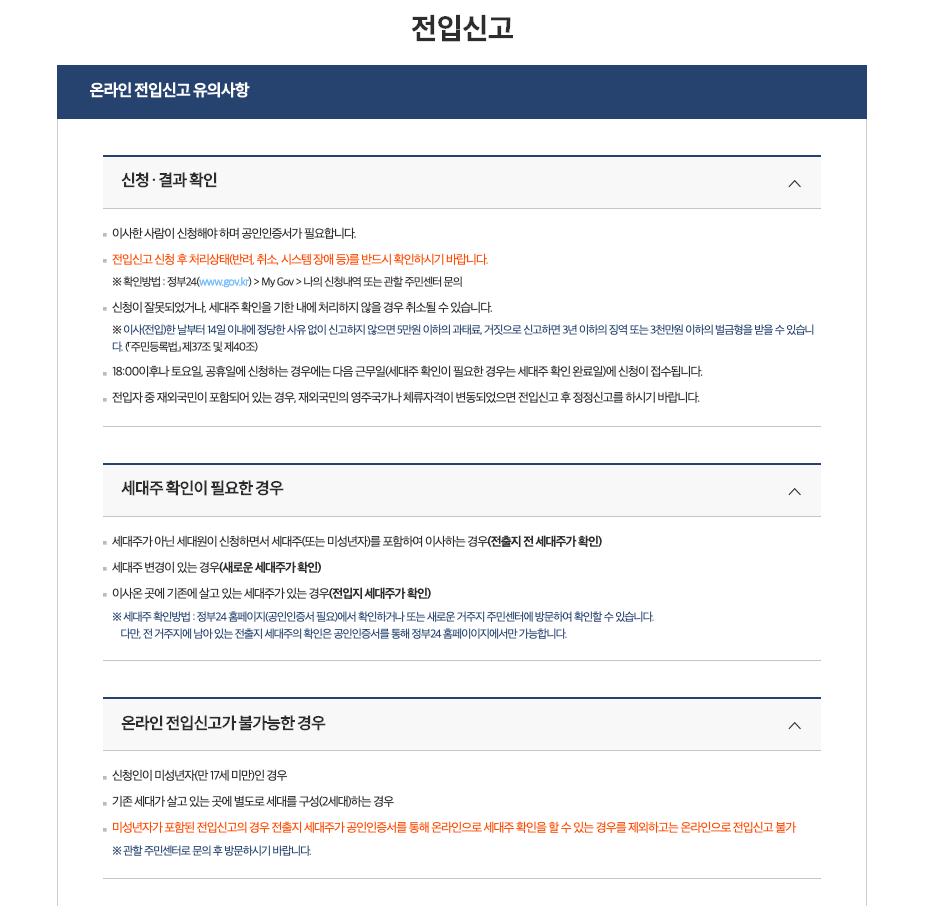 공인인증서로 로그인을 하면 다음 화면으로 온라인 전입신고를 진행할 때 유의사항들이 안내되어 있다. 해당 사항을 꼼꼼히 읽어보면 당연히 좋으나 사실 필자는 그냥 좀 무시하는 편이라 스근하게 바로 아래에 확인했다는 란에 체크를 하고 다음 단계로 넘어갔다. 물론 숙지하고 있으면 나중에 손해볼 일은 없으나, 내용 자체가 엄청 까다롭지 않은 것들이기에 가뿐하게 필자는 스킵을 했다. 왜냐? 시간은 금이기 때문이다. 굳이 여기에 시간을 질질 끌 필요는 없다고 생각한다.