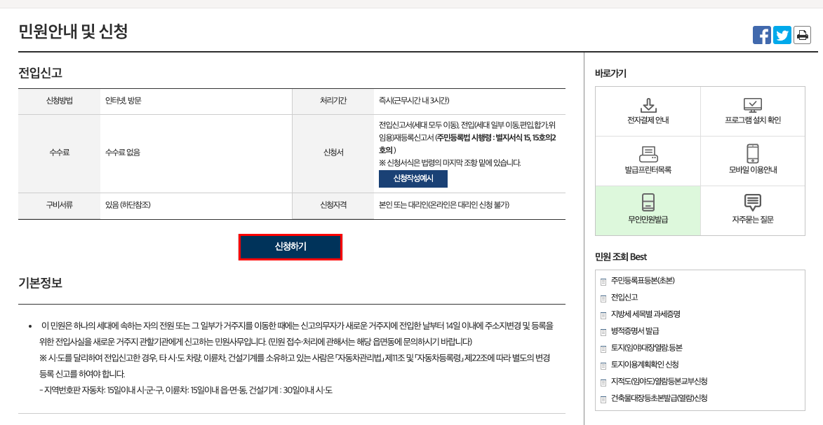 전입신고 아이콘을 누르면 전입신고와 관련된 안내창이 등장한다. 신청방법은 온라인, 오프라인 모두 가능하며 수수료는 무료인 굉장히 스근한 작업이다. 기타 안내사항 및 정보들을 확인했다면 '신청하기' 버튼을 눌러 다음 단계로 넘어가보자.