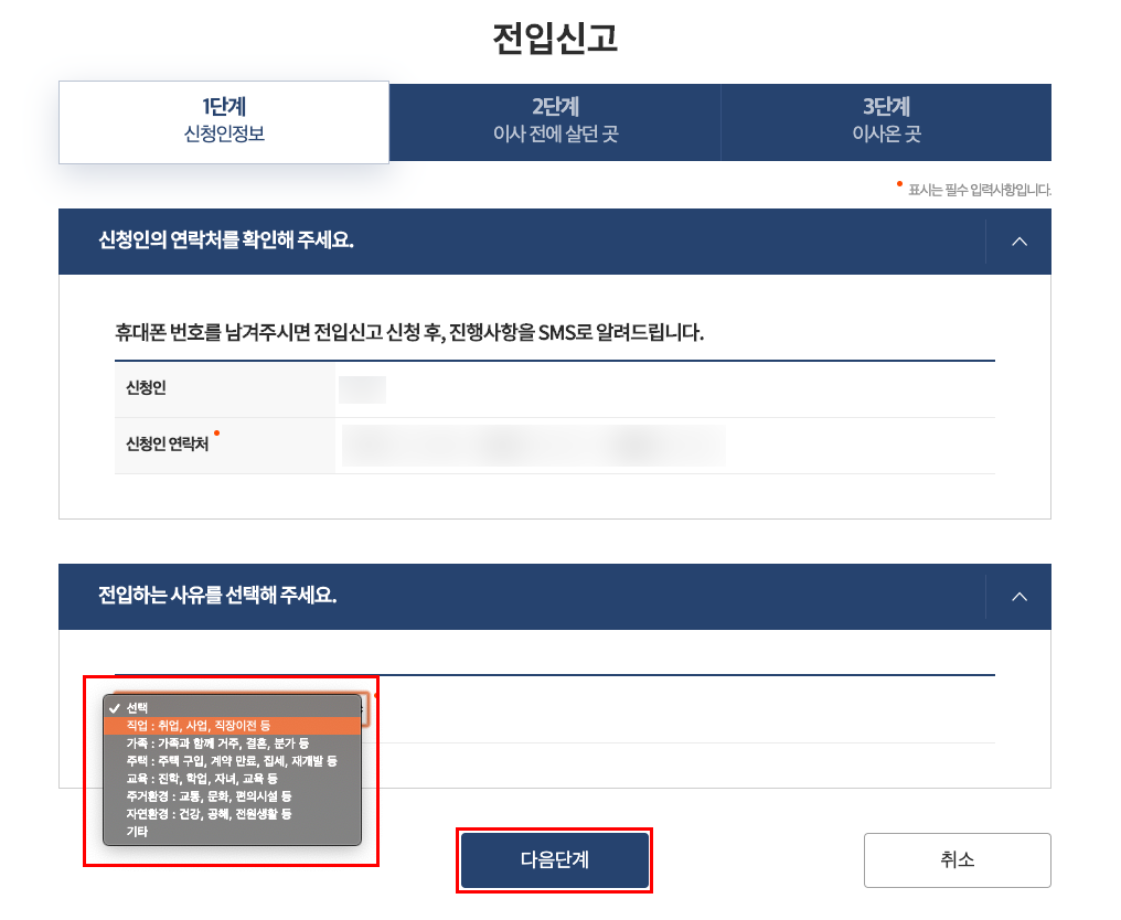 이제 본격적으로 민원24에서 온라인 전입신고 인터넷 신청하는 법에 대해 살펴보자. 일단 가장 먼저 신청인 정보를 기입하게 된다. 내 이름과 연락처를 기입한 후 사유를 선택한다. 사유는 굉장히 다양하다. 취업 / 가족 / 주택 / 교육 / 주거환경 / 자연환경 / 기타 등 7가지의 메뉴 선택지가 나와있다. 아마 필자가 생각할 때 '직업' 메뉴와 '가족' 메뉴, 그리고 '주택' 메뉴를 보통 많이 선택하지 않을까 생각한다. 여러분들이 곰곰히 생각해보고 해당 사유를 선택한 후 아래의 '다음 단계' 버튼을 눌러주도록 한다.