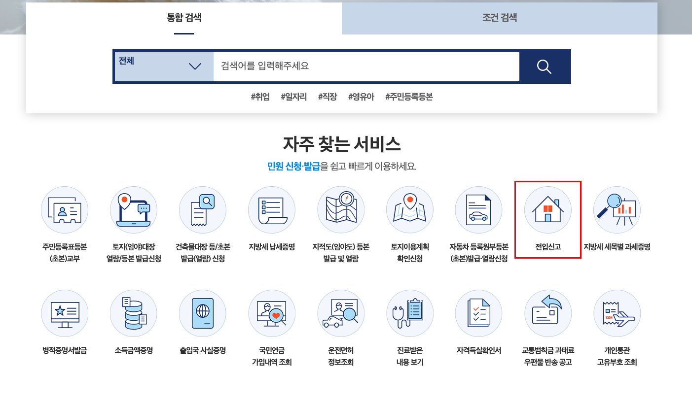그럼 위와 같이 우리가 그토록 고대하던 민원24 메인 홈페이지 화면이 등장한다. 여기서 아래 '자주 찾는 서비스' 메뉴를 주목하도록 하자. 이전의 주민등록표등본 발급과 관련된 포스팅을 했을 때 봤던 메뉴와 더불어 다양한 민원처리 메뉴들이 등장해있다. 그 중 우리가 이용해야할 메뉴는 바로 '전입신고'와 관련된 부분임을 잊지말자.