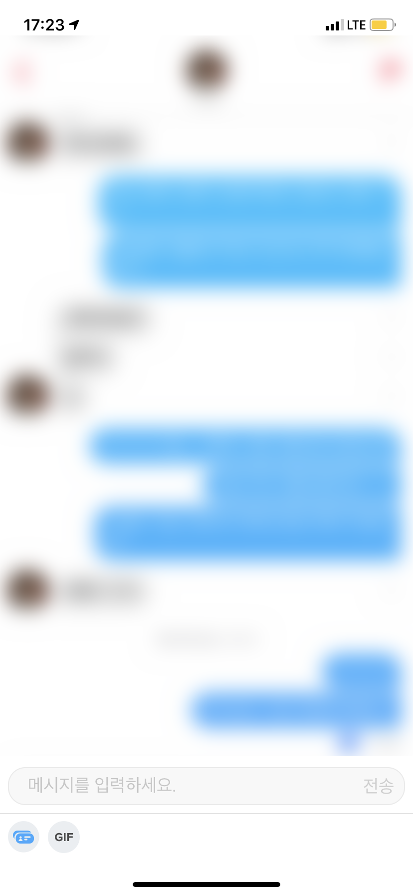 우측의 말풍선 아이콘을 클릭하면 바로 채팅창이 나오게 된다. 채팅창에서는 매칭이 완료된 상대방과 채팅한 채팅 목록들을 확인할 수 있다. 사실 여기서 필자가 틴더 어플에 굉장히 아쉽다는 평을 주고 싶다. 기본적으로 매칭 되는 시스템이나 UI 디자인 등은 개인적으로 만족을 하나, 채팅의 경우 오류가 좀 심한 편이라고 생각한다. 카카오톡과 같이 뭔가 최적화된 어플만 사용하다 와서 그런 거일 수도 있으나, 채팅을 할 때 약간씩 밀리는 현상이나, 톡이 오지도 않았는데 알람이 뜨는 경우도 종종 있었다. 애초에 불안정한 채팅 시스템이라 그런지 상대방이 답을 주는 것도 굉장히 느리다. (물론 자신이 틴더 어플을 잘 안 해서 DM으로 달라고 자기소개 프로필에 적어놓은 분들이 많다.)