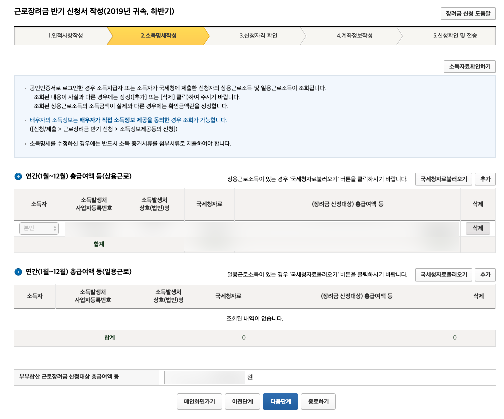 다음 단계로 넘어가면 자동으로 국세청에 등록된 내 소득 자료들이 등장한다. 추가나 수정이 필요한 부분은 그대로 해놓으면 되는데 아마 여러분들 또한 별도의 수정을 할 필요가 없을 것이다. 자격요건이 된다면 다음 단계로 넘어가 진행하면 된다. 다만 필자는 아쉽게도 자격요건에 해당하지 못해 해당 단계까지 밖에 도달할 수 없으니 이 점 양해 바란다.