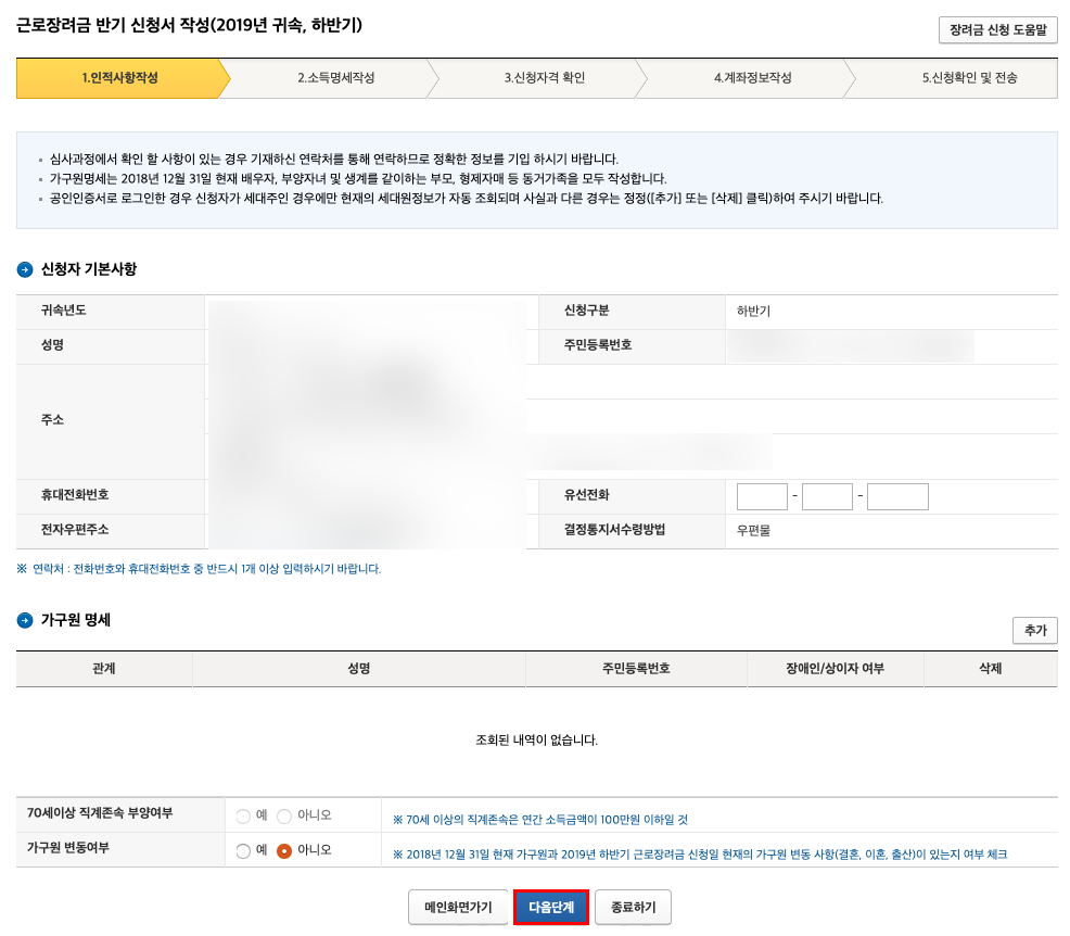 만약 안내를 별도로 받지 않은 분이라면 '신청하기 > 일반신청하기(안내문자를 안받은 경우)'를 클릭해준다. 그럼 다음 화면으로 위와 같이 넘어가게 된다. 간단한 자신의 정보를 입력하고 가구원 상세를 편집한 후 다음 단계로 넘어가도록 하자. 필자의 경우 이미 부모님이 자동으로 가구원 상세 항목에 등록되어 있었으나, 서울에서 따로 전입신고를 하여 거주하고 있기에 단독 가구로 신청을 하고자 해당란을 비워두었다. 아래에 필자가 근로장려금 자격요건에 대해 상세하게 안내할 예정이니 해당 자격요건을 보고 가구원을 편집해주도록 하자.