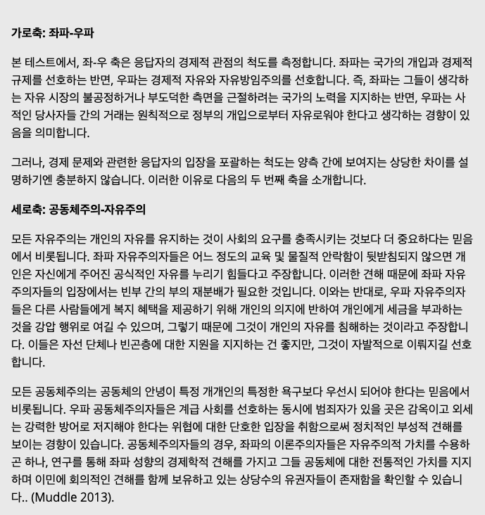 아래로 내리면 가장 먼저 축에 대한 정보가 나온다. 가로축은 좌파와 우파 간의 척도를 나타낸 것이다. 설명지를 보면 좌/우 축은 응답자의 경제적 관점의 척도를 측정한다고 나와있다. 따라서 좌파는 국가의 개입과 경제적 규제를 선호하며, 우파는 경제적 자유와 자유방임주의를 선호한다고 나와있다. 이런 부분을 잘 참고하고 자신이 어느 축으로 치우쳤는지 확인해보면 된다.