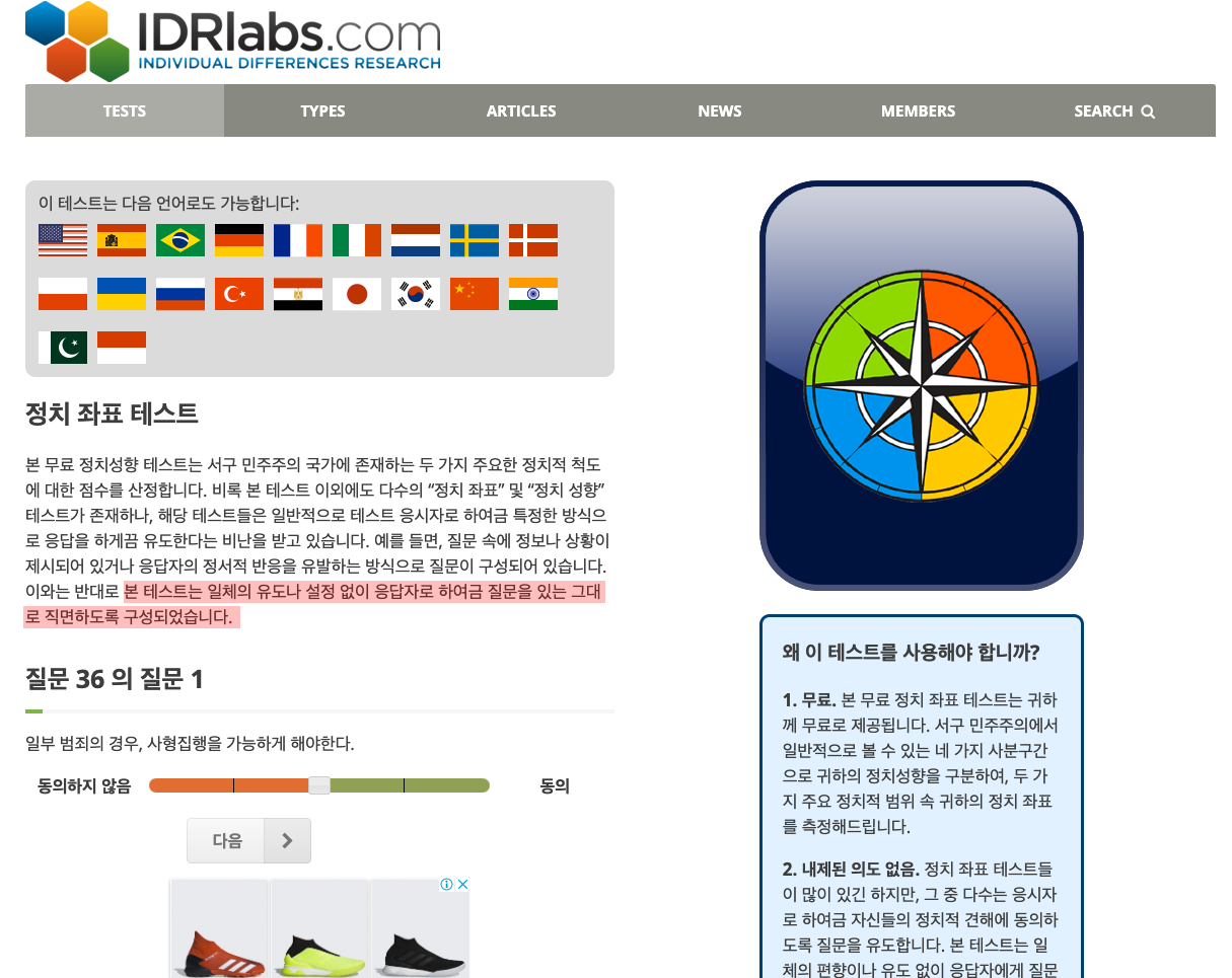 사이트 이름은 'IDR labs'라는 사이트다. 이름은 생소하다. 일단 여기선 정치성향 테스트뿐만 아니라 다른 다양한 테스트도 진행해볼 수 있다. 상단의 메뉴바에서 'TESTS' 메뉴를 클릭하면 수많은 테스트 목록들이 등장한다. 물론 영문이라 헷갈릴 순 있겠지만 한글도 지원해주니 걱정하지 말자.