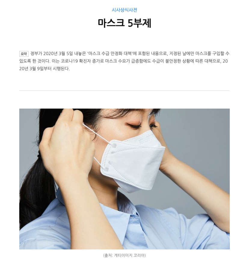 일단 마스크5부제의 정의와 취지를 스근하게 알아보도록 하자. 코로나19로 인하여 마스크의 수요가 높아지고, 그에 따른 마스크 수요가 급증하나, 공급량은 한정되어 있어 마스크 품귀현상과 사재기 현상이 발생하게 된다. 그에 따라 정부가 현 재난상황을 타파하고자 마스크 공급 및 유통을 통제하기 위한 제도를 마련하기에 이른다.