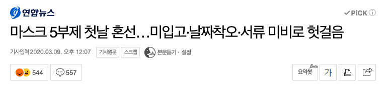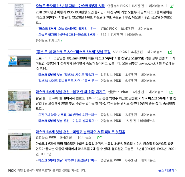 오늘 국민 사이트 네이버에서 실시간 검색어에 등장한 마스크5부제. 오늘 코로나19 마스크 대란을 해소하기 위한 그 첫 번째 발걸음이 시작되었다. 아무래도 첫 시행이다 보니 이래저래 문제가 많은 듯하다. 우리 회사 직원이 실제로 오늘 해당되는 요일이기에 직접 구매를 위해 약국을 방문했다고 한다. 물론 이전보다는 사람의 몰림 현상이 미미하지만 어느 정도 해소된 듯하다고 느꼈다고 한다. 하지만 아직 제도적인 보완이 미흡하고, 아무래도 급하게 진행되다 보니 통제하는 데 있어 약간의 딜레이와 어려움이 있어 보인다고 한다.