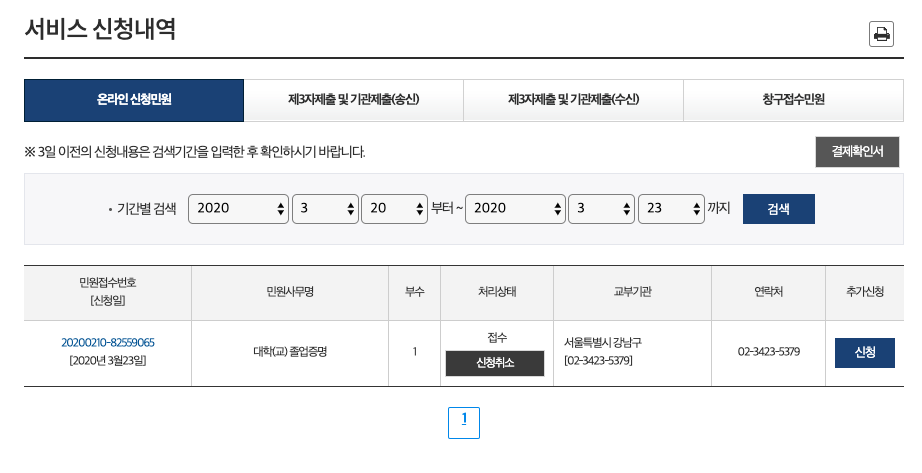 그리고 이제 접수 완료가 되었다. 접수 완료가 되면 위와 같이 신청 내역이 등장한다. 필자의 경우 회사가 강남구청 근처에 위치하여 강남구청으로 발급기관을 선택했다. 참고로 필자가 좀 늦은 시간에 신청을 해서 아직 처리상태가 '접수'에 머물러 있다. 보통 영업시간 중에 신청을 하게 된다면 빠르면 1-2시간, 늦어도 4시간 내에는 처리가 된다. 만약 처리가 안되고 계속 '접수'라고 떠있다면 옆에 있는 연락처에 기재된 번호로 연락하여 안내받으면 된다. 그럼 지금까지 대학교 졸업증명서 인터넷발급 정부24에서 하는 방법이었다.