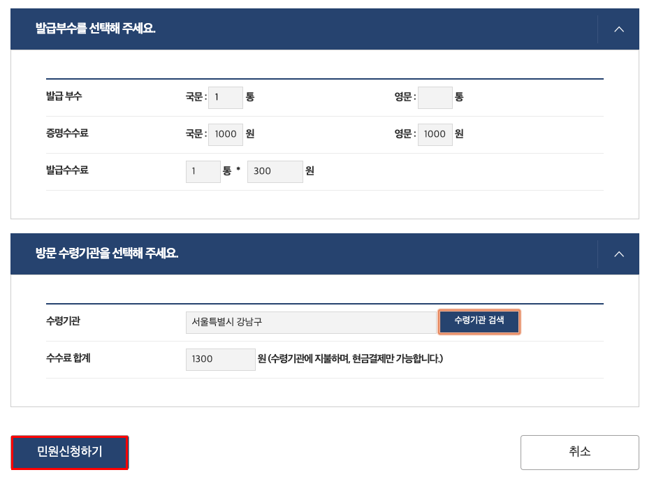 그리고 스크롤을 내리면 하단에는 발급 부수, 수수료가 안내되어 있으며, 방문 수령 기관을 선택할 수 있다. 수령 기관의 경우 앞서 설명한 바와 같이 근처에 위치한 구청이나 주민센터에서 발급이 가능하다. 수수료는 증명 수수료 1,000원, 발급 수수료 300원으로 도합 1,300원의 비용이 든다. 거즌 뭐 이 정도쯤이야 껌 값 아니겠는가.