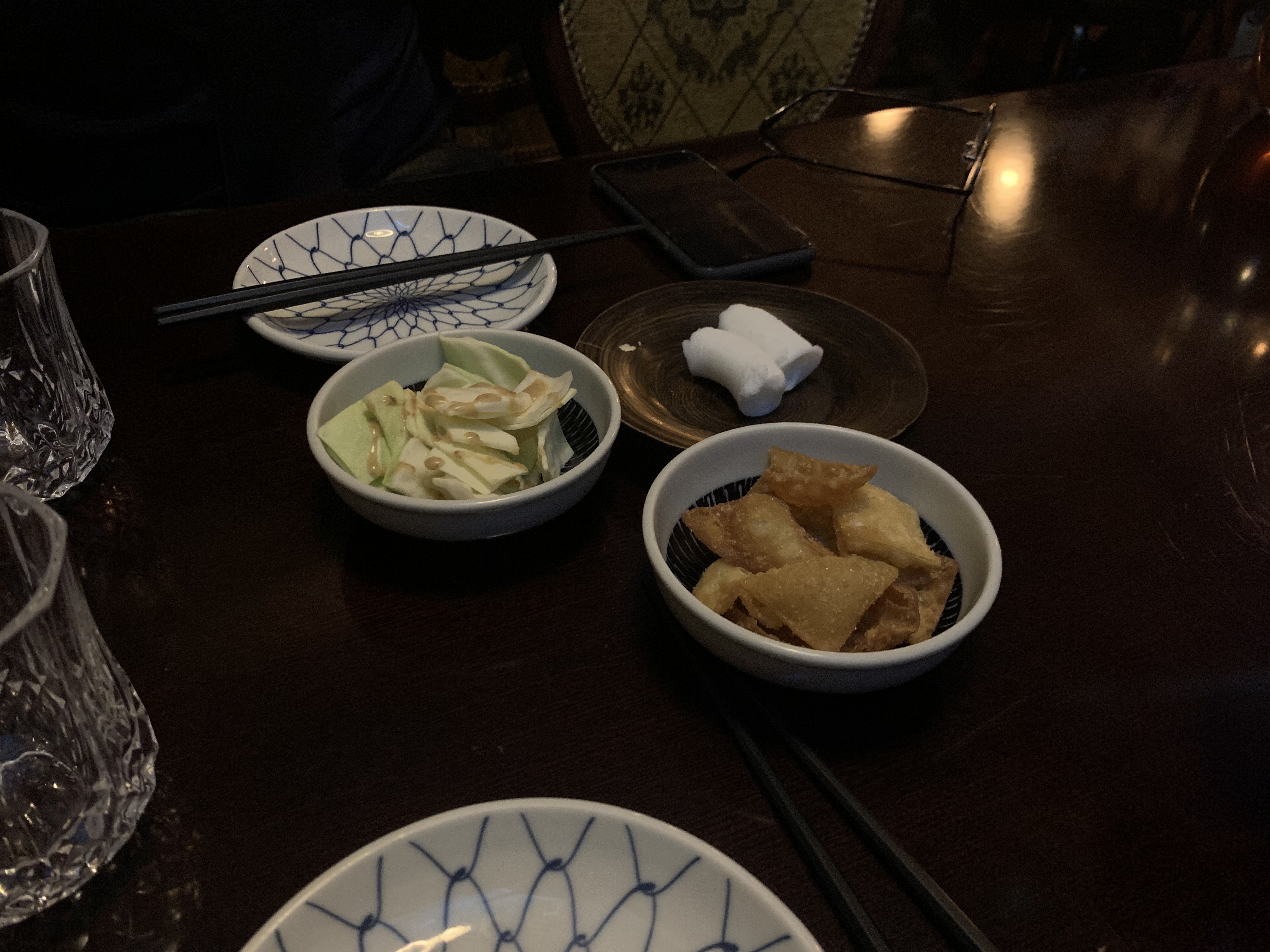 기본적으로 세팅은 샐러드와 튀김 과자, 물티슈를 제공한다. 더불어 물은 일반 생수가 아닌 무엇을 달인 물로 추정되는데 아마 보리차인 듯하다. 필자가 전문적으로 맛을 보는 사람이 아니기에 아닐 수도 있지만 꽤나 건강하게 케어 받는 느낌이다. 이제부터 본격적인 메뉴들이 등장할 것이다. 필자는 위 주문내역을 보면 알겠지만 3가지 메뉴를 주문했지만 이제부터 나올 사진은 5가지 정도 메뉴가 나온다. 즉 여기에서 2가지 정도가 서비스로 제공받은 것인데 왜 서비스를 주었는지 모르겠으나 아마 기본 반찬인 듯 싶기도 하다.