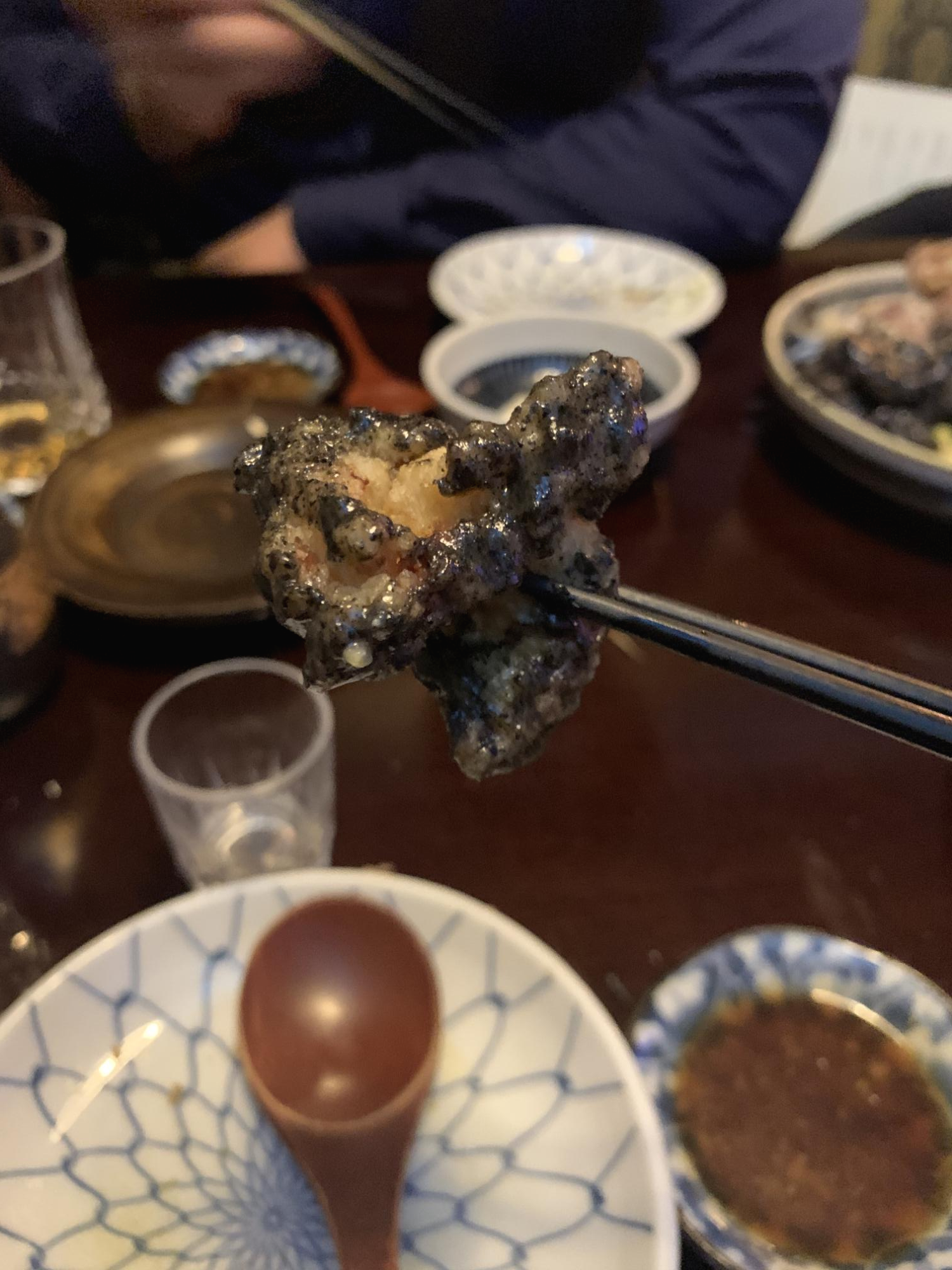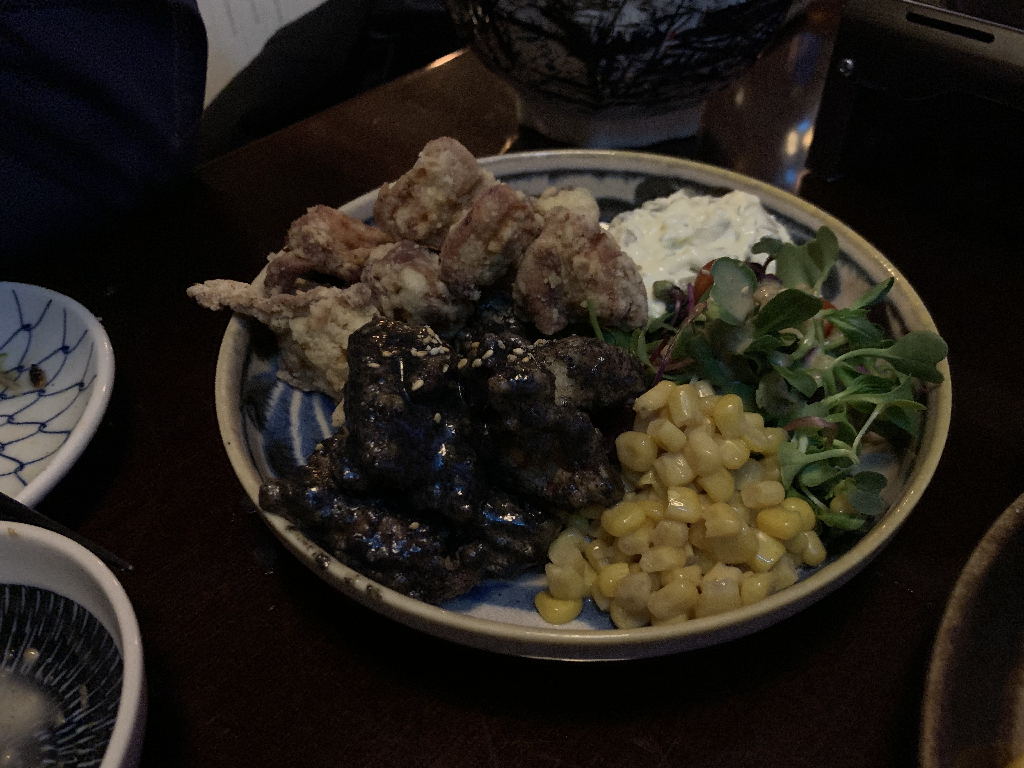 구성은 타르타르 소스와 샐러드, 옥수수 콘과 함께 흑임자 소스가 곁들여진 닭 가라아게와 소스가 곁들여지지 않은 후라이드 가라아게 2종류가 나온다. 양은 사진에서 보는 바와 같이 많지는 않으니 참고하자. 2인이면 딱 맞을 양이다. 맛은 후라이드는 일반적으로 먹는 가라아게 느낌이다. 거기에서 조금 더 바삭하고 신선하다는 느낌이 든다. 단연코 압도적이었던 것은 흑임자 소스가 곁들여진 가라아게. 흑임자라고 하면 뭔가 씁쓸하고 색도 검은색이라 조금 꺼려졌는데 맛은 굉장히 달달하면서 식욕을 돋우는 맛이다. 꽤나 풍미가 있기에 흑임자 소스가 곁들여진 가라아게만 먹은 듯하다. 개인적으로 후라이드를 빼고 흑임자로만 통일했으면 어떨까 하는 정도.
