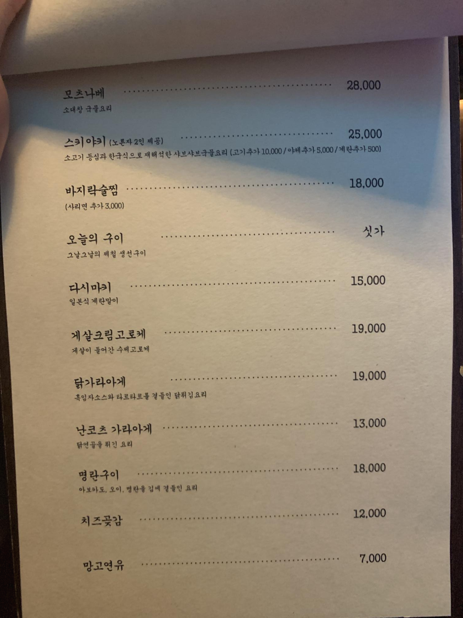 메뉴판을 살펴보자. 코팅이 되거나 그런 건 아니지만 종이 재질이 빳빳하니 넘기는 느낌이 좋았다. 익선동에 위치한 이자카야 치고는 조금 저렴한 축에 속하는 듯하다. 일단 가성비 부분에선 나름 만족했다. 꽤나 다양한 메뉴들이 있어 무엇을 할지 몰라 추천을 받아서 메뉴를 주문했다. 필자는 필자를 포함한 성인 남자 3명이서 방문을 했으며, 주문 내역은 아래와 같으니 참고하자.