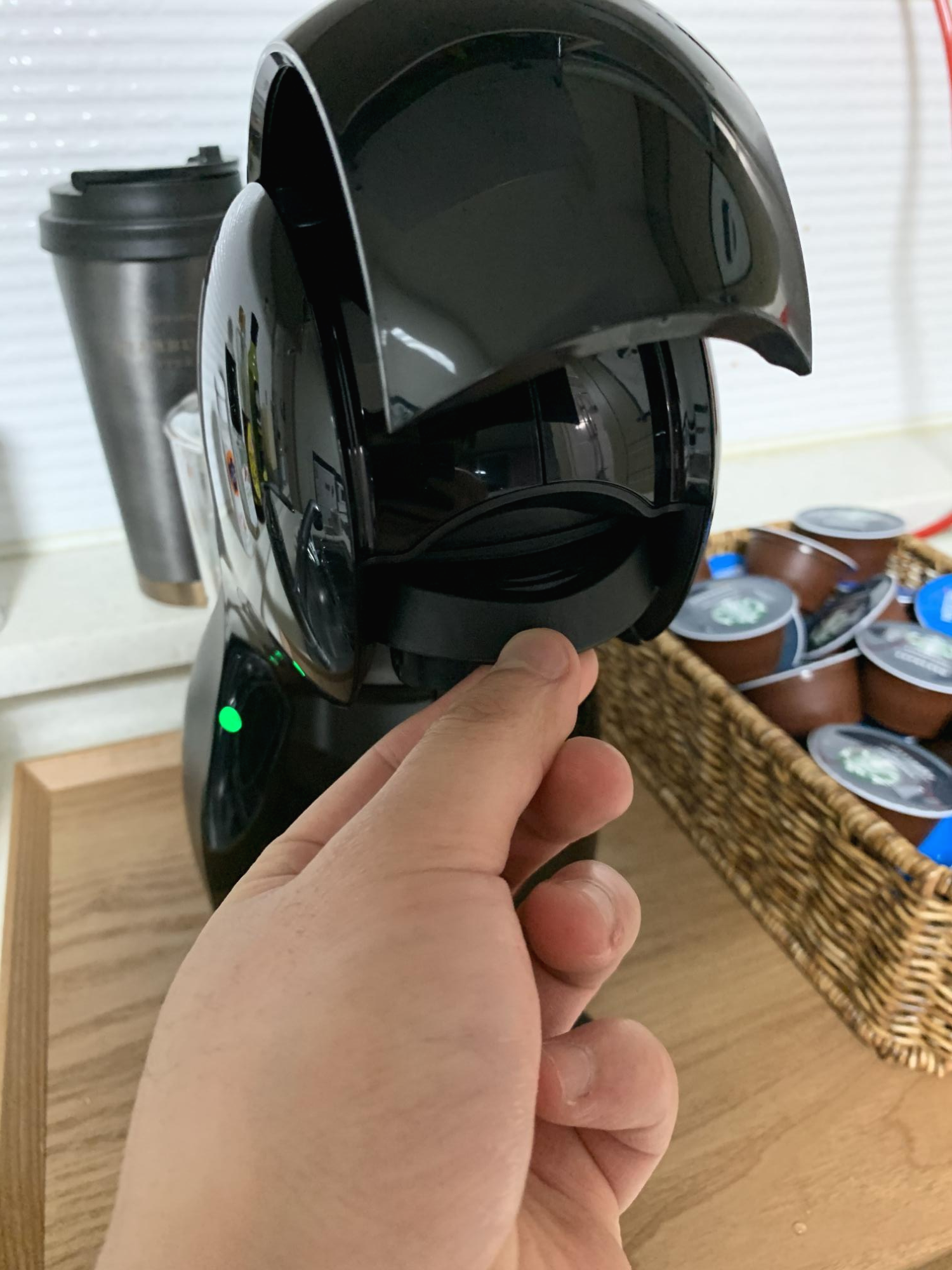 물을 채웠다면, 이제 청소 캡을 캡슐 넣는 통에 안착시키고 넣어주도록 하자. 그리고 뚜껑을 닫으면 끝. 참고로 이렇게 뚜껑을 닫고 바로 진행하지 말고 왼편에 있는 불빛이 초록색으로 바뀔 때까지 기다려야 한다. 아직 빨간색이라면 좀 더 기다리고, 계속 기다려도 빨간색이 유지된다면 뚜껑이 덜 닫혔는지, 통에 문제가 있는지 확인을 해야 한다.
