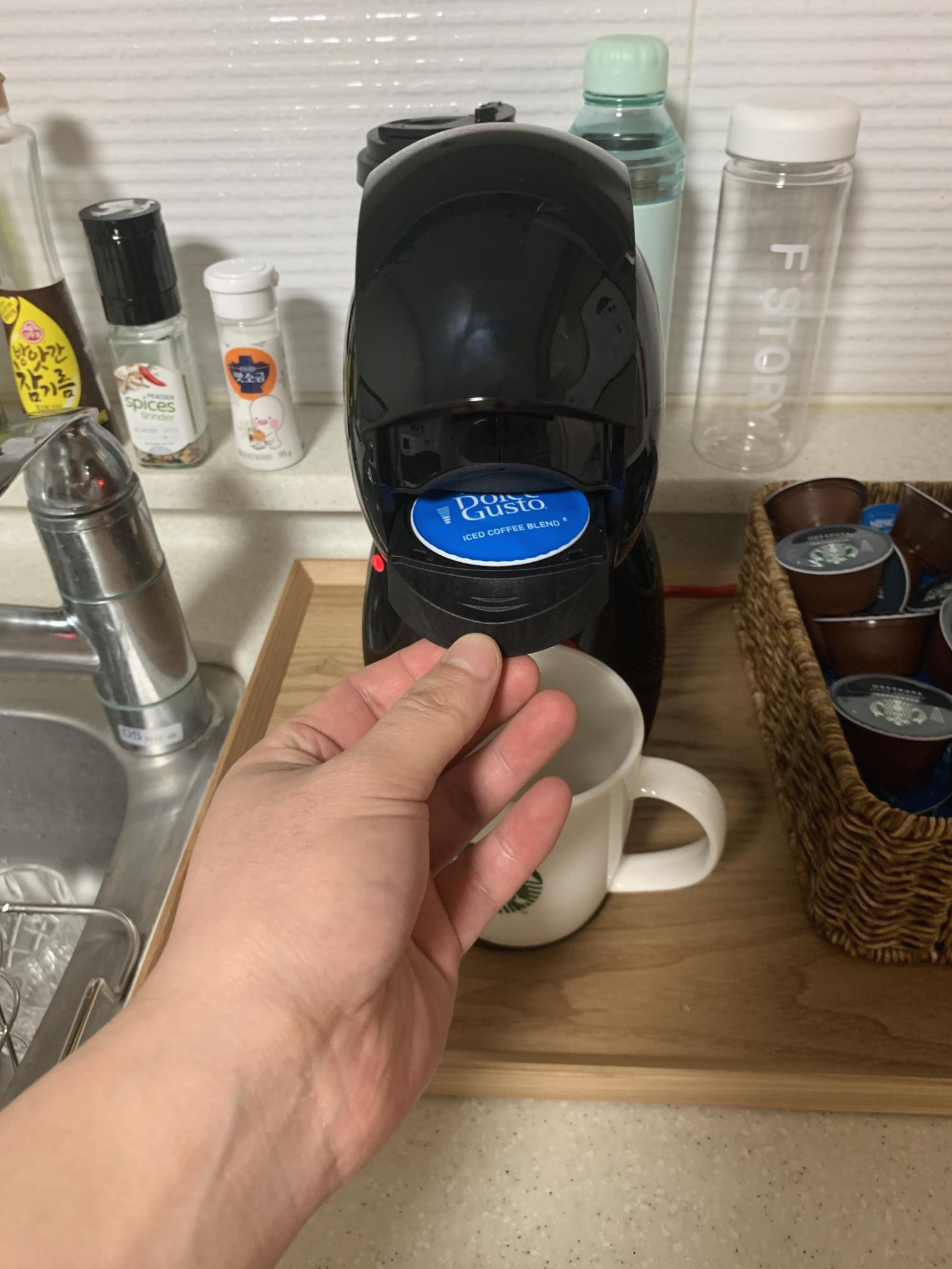 두근두근.. 설레는 첫 커피를 두고 굉장히 심히 떨린다. 일단 캡슐 통을 입구에 넣고 닫은 후에 물을 내리면 된다. 필자는 처음에 아이스 아메리카노 캡슐이라길래 차가운 물을 급수를 했다. 하지만 첫 시도는 실패. 차가운 물로 내려서 그런가 맛은 그럴싸하지만 깊이감이 떨어진다. 이리저리 돌려보니 차가운 물이 아닌 뜨거운 물로 내려야 진득한 커피가 나오며, 캡슐 안에 커피를 다 쓰면 점점 색깔이 옅어져 자연스럽게 아메리카노가 되는 원리인 듯하다.