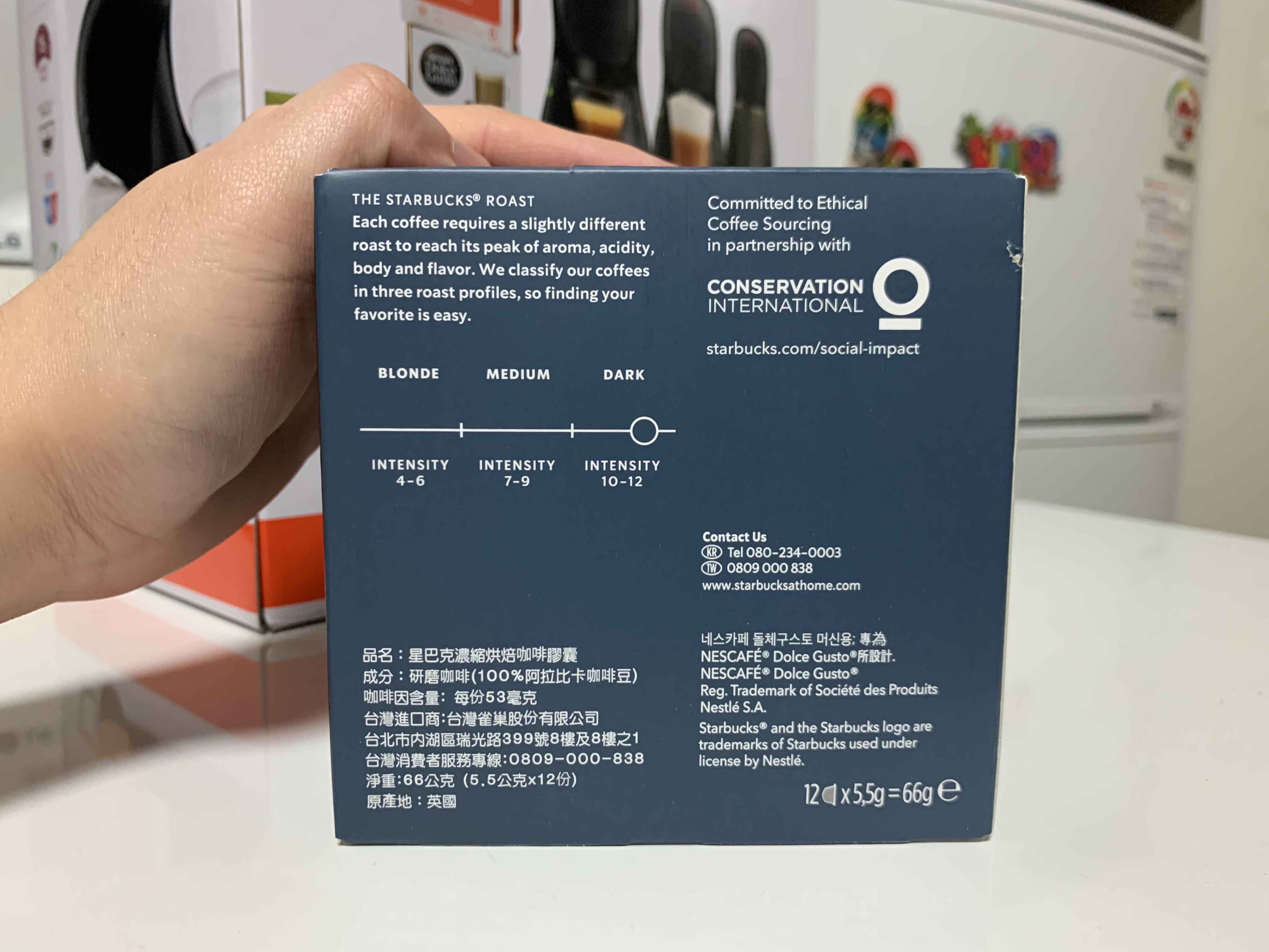 박스 뒷면에 보면 영어로 뭐라고 기재가 되어있고, 그 맛의 단계가 나와있다. 스타벅스 에스프레소 로스트는 'DARK' 단계로 나와있는데, 일단 필자는 정확하게 이게 어떤 것을 의미하는지는 모르겠으나 직접 맛본 바로는 묵직하고 산미가 없다는 뜻이 아닐까 추측해본다.