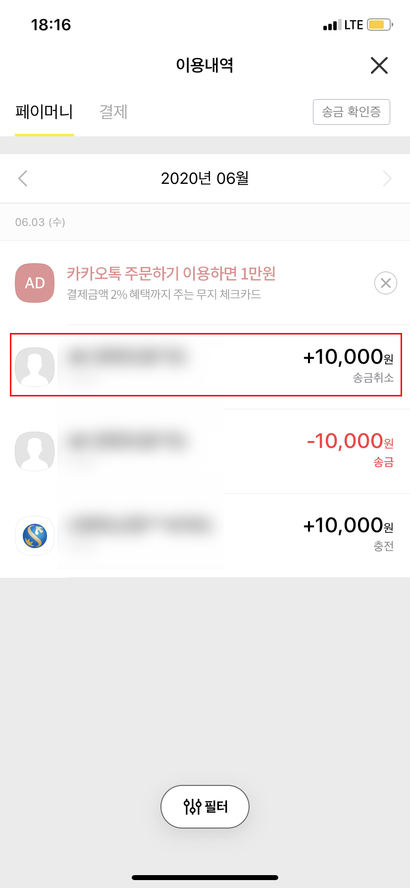 그럼 바로 송금취소가 완료된 내역이 결제내역에 추가로 뜨게 되며, 카카오페이 잔액도 종전에 0원이었던 게 취소 후 그대로 만원이 들어와 있는 모습을 볼 수 있다. 이렇게 간편하고 스근하게 카카오페이 송금취소를 마무리할 수 있다.