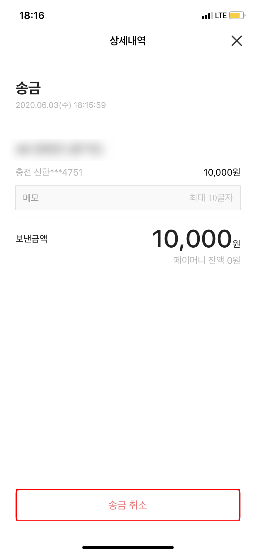 상세 내역으로 들어가면 A에게 얼마를 보낸 내역이 나온다. 하단을 주목해보자. '송금 취소'라는 버튼이 눈에 아른아른거릴 것이다. 즉 상세 내역에서 카카오페이 송금취소를 할 수 있다는 것이다. 해당 버튼을 탭 해주도록 하자.