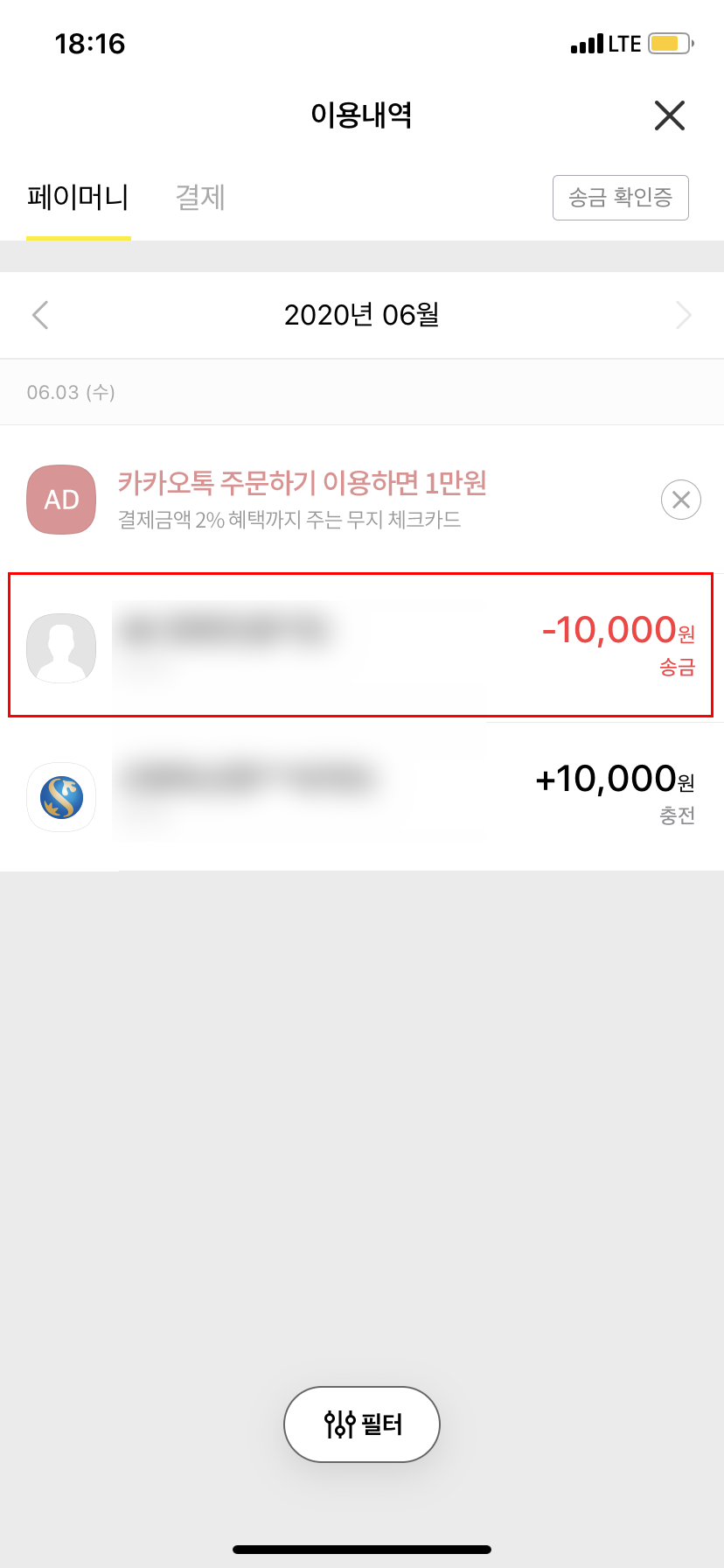 그럼 카카오페이 화면으로 넘어간다. 여기서도 똑같이 '(말풍선 아이콘) pay'이 있을 것이다. 해당 아이콘을 탭 하면 제일 우측 사진과 같이 나의 입금 / 출금 내역이 표시된다. 여기서 내가 잘못 송금한 친구의 내역을 탭 해주도록 하자.