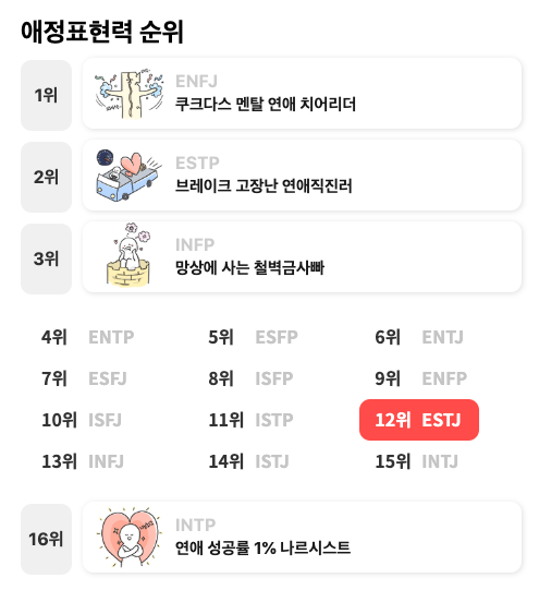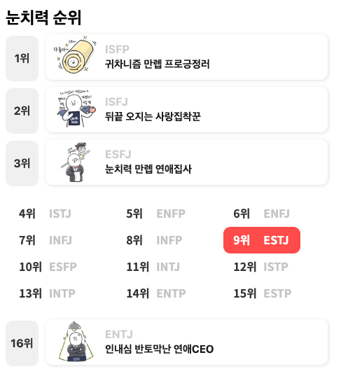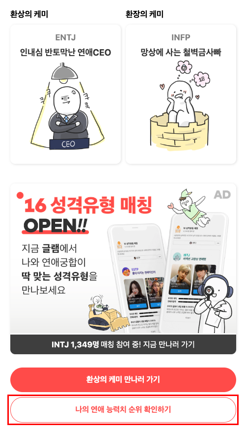 스크롤을 내리면 필자의 성격 유형과 가장 잘 맞는 유형과 맞지 않는 유형이 나온다. 뭐 이거야 결국 사람마다 케바케니 그냥 참고 정도만 하고, 아래의 '나의 연애 능력치 순위 확인하기' 버튼이 눈길을 끌어 한 번 클릭해보았다.