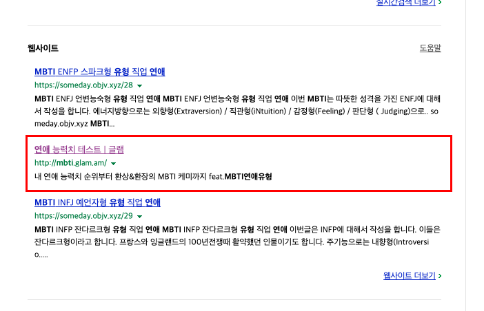 일단 네이버와 같은 검색 포털 사이트에 'MBTI 연애유형 (테스트)' 키워드를 검색한다. 그럼 좌측 화면과 같이 뉴스 기사와 블로그 글들이 나올 것인데, 좀 더 내려보면 '웹 사이트' 카테고리가 등장할 것이다. 그중에 2번째 '글램'이라고 적혀있는 사이트로 접속하면 MBTI 연애유형 검사를 진행해볼 수 있다. 물론 센스 있게 필자가 링크를 가지고 왔으니 이 글을 보는 독자분들이라면 아래 링크로 스근하게 접속하면 된다. (필자 = 센스쟁이 인정?)