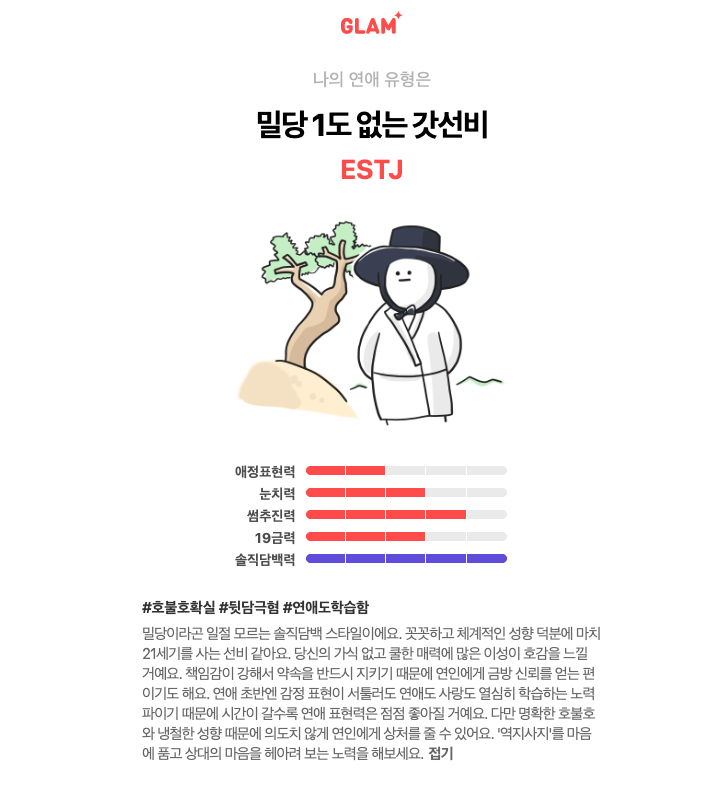 *(참고) 글램 MBTI 연애유형 능력치 테스트 URL :: http://mbti.glam.am/intro