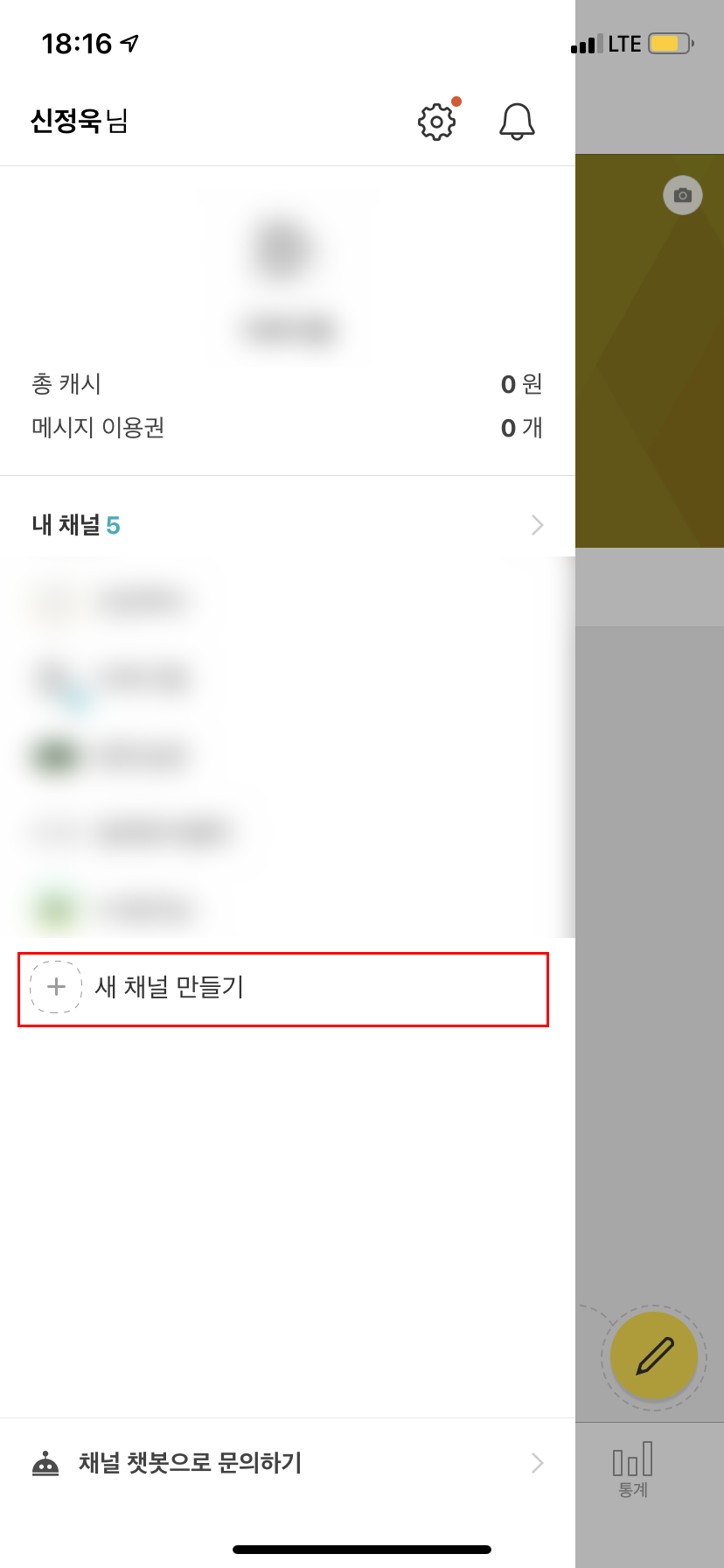 아이콘을 탭 하면 내 채널 목록이 등장한다. 필자가 PC 버전에서 보여줬다시피 5개의 항목이 동일하게 등장한다. 그리고 아래를 보면 '+ 새 채널 만들기'라는 항목이 있다. 사실 이 과정부터는 PC와 정말 동일하기 때문에 어렵지 않을 것이다.