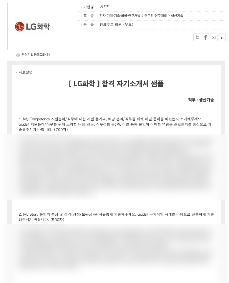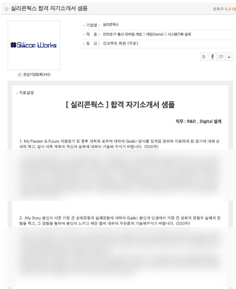 필자의 경우 일단 두서없이 여러분들에게 예시를 보여주고자 실리콘웍스와 LG화학의 자기소개서 예시 내용을 살펴보았다. 두 가지 모두 합격한 사람의 자기소개서 내용이며, 이는 인크루트 회원에게만 제공되는 것이기에 부득이하게 모자이크를 한 점 양해 부탁한다.