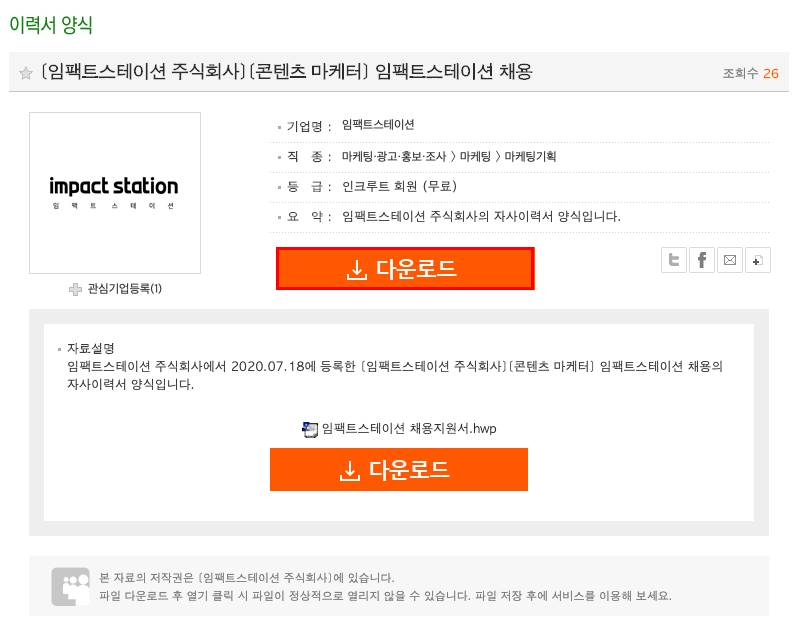 각설하고 자신이 찾고자 하는 회사나, 혹은 직종의 이력서를 다운로드하고 싶다면 그 방법은 간단하다. 많은 목록 중에서 자신이 찾고자 하는 목록을 클릭하면 왼쪽 사진과 같이 정보가 등장하게 된다. 거기서 '다운로드' 버튼을 클릭하면 워드, 한글파일, 엑셀 등의 업로드된 파일의 확장자로 다운로드할 수 있다. 다만 '유료'의 경우 일정 비용을 결제해야 할 수 있다는 점 참고하기 바란다. 물론 유료 자료가 훨씬 더 퀄리티가 좋을 순 있으나 개인적으로 무료 자료만 봐도 충분하다고 생각한다.