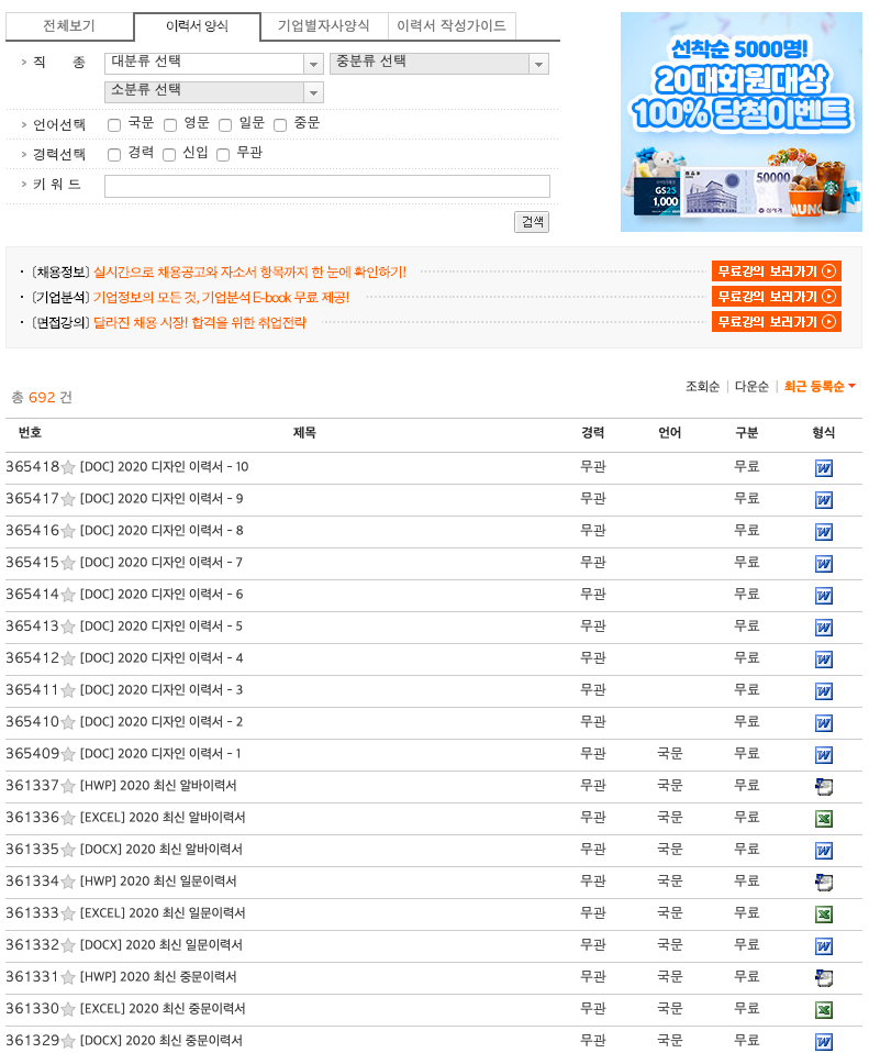 이력서 양식에 대해 분류를 디테일하게 나누었다면 그와 관련된 다양한 자료들이 등장하게 된다. 또한 이력서에 첨부되는 언어들도 분류하여 검색할 수 있으며, 경력 선택도 설정할 수 있다. 만약 이력서 양식이나 예시를 찾고자 한다면 디테일한 직종까지 세분화하여 검색하기 바란다. 일반 전체보기로 하면 자료의 양이 굉장히 방대하기 때문에 찾는데 굉장히 오랜 시간이 걸릴 수 있기 때문이다.