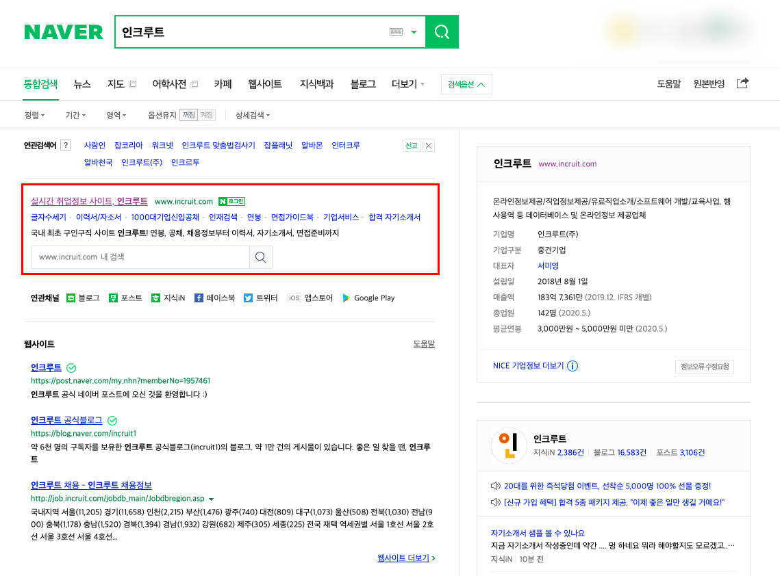 자소서 양식이나 샘플을 참고하고자 한다면, 가장 먼저 인크루트 사이트에 접속을 하는 것이 선행되어야 할 것이다. 포털 사이트 검색창에 '인크루트'라는 키워드로 검색을 해보자. 사실 인크루트와 같은 각 분야의 대형 업체라면 위와 같이 검색만 해도 업체와 관련된 정보들이 굉장히 많이 나오게 된다. 다른 건 사실 볼 필요는 없고, 제일 상단에 나오는 인크루트 사이트 링크로 접속하면 된다. 하지만 이 글을 보시는 독자분들이라면 귀찮게 검색을 다시 할 필요가 없다. 바로 아래 필자가 링크를 가지고 왔으니. (센스!)