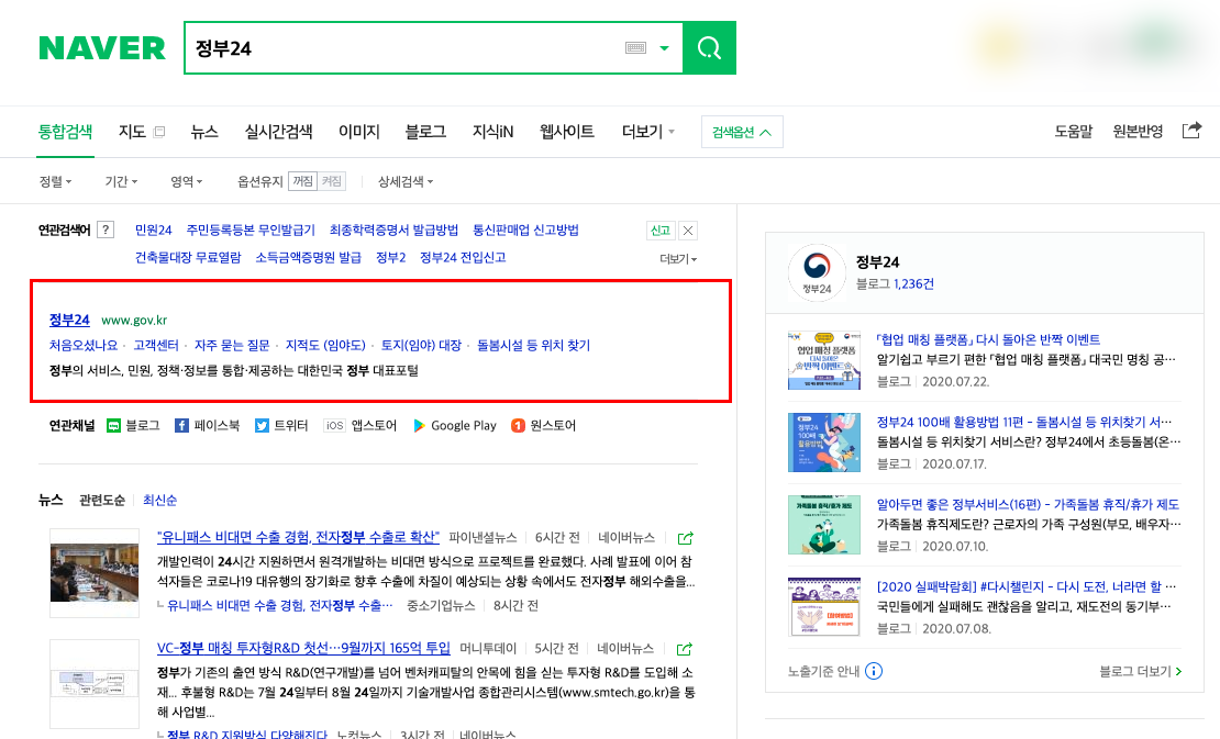 일단 포털 사이트로 접속하여 검색창에 '정부24'라고 검색한다. '민원24'라고 검색해도 동일하게 나온다. 쨌든 검색하면 최상단에 정부24 사이트 URL이 등장한다. 해당 사이트로 접속하도록 하되, 이 글을 보시는 독자분들이 왔다 갔다 매우 귀찮을 수 있으니 아래 링크를 남겨두도록 하겠다. 아래 링크로 접속하기 바란다.