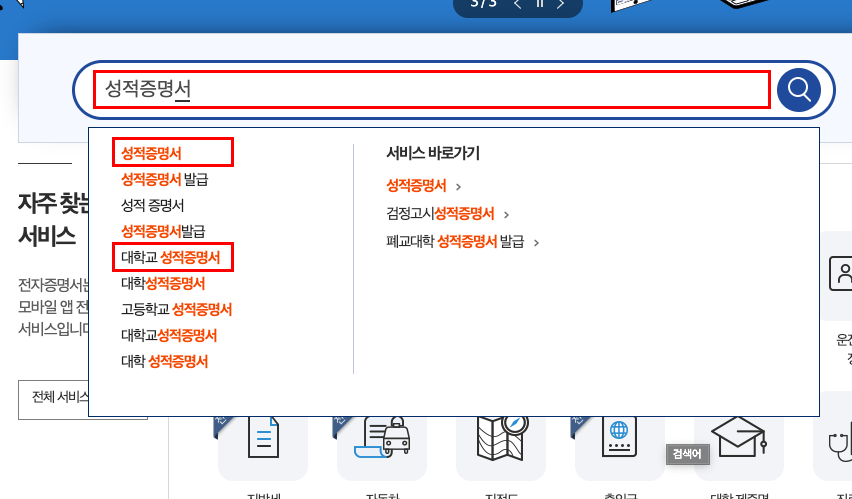 일단 다른 문서나 민원들보단 우리는 우리 할 일을 해야 하는 게 우선 아니겠는가? 정부24 홈페이지 중간에 보면 검색할 수 있는 검색창이 마련되어 있다. 이 검색창에서 '성적증명서'라는 키워드로 검색을 해주면 된다. 성적증명서 키워드로 검색시 자동완성 키워드로 '성적증명서' 혹은 '대학교 성적증명서' 둘 중 하나를 클릭해서 검색 결과를 보면 된다.