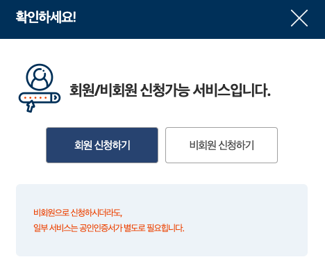 그럼 회원/비회원 신청 가능한 서비스라는 안내 창이 등장한다. 회원의 경우 그냥 공인인증서 로그인으로 스근하게 넘어가지만 비회원의 경우 비회원 인증에 대한 절차를 따로 한 번 더 거치게 된다. 더불어 비회원이라 하더라도 공인인증서를 사용할 수 있는 경우가 있을 수 있다고 한다. 이런 경우라면 미리 회원가입과 공인인증서를 받아놓고 인터넷 발급받는 것이 간편할 듯하다.