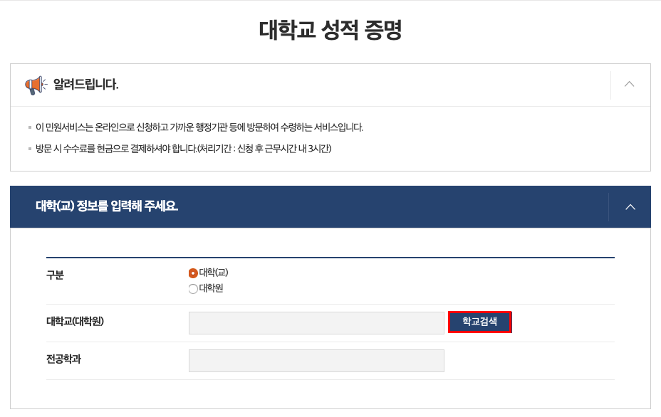 그럼 대학교 성적증명서 인터넷발급을 위한 정보 입력하는 창이 등장한다. 일단 가장 먼저 대학교 정보를 입력하는 란이 나온다. 자신이 대학교에 대한 성적증명서를 발급받고 싶다면 '대학(교)'에 체크를, 대학원의 성적증명서를 발급받고 싶다면 '대학원'에 체크하면 된다.